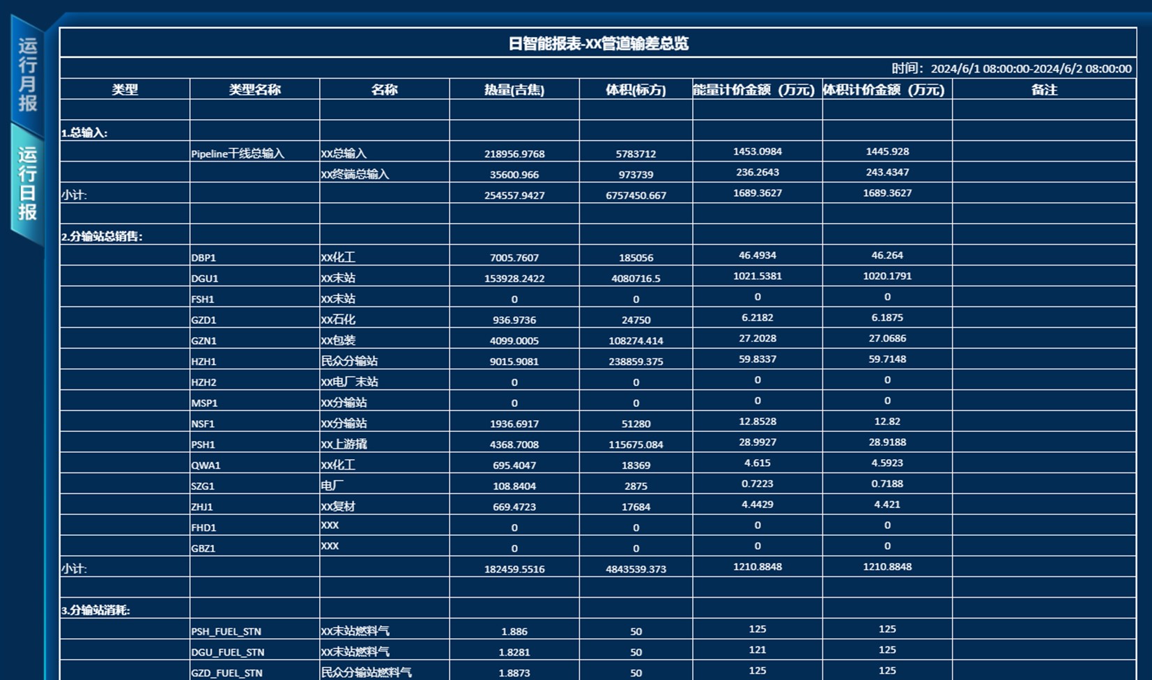 提供日、周、月、年生產智能報表,以及供銷存、輸差分析報表;