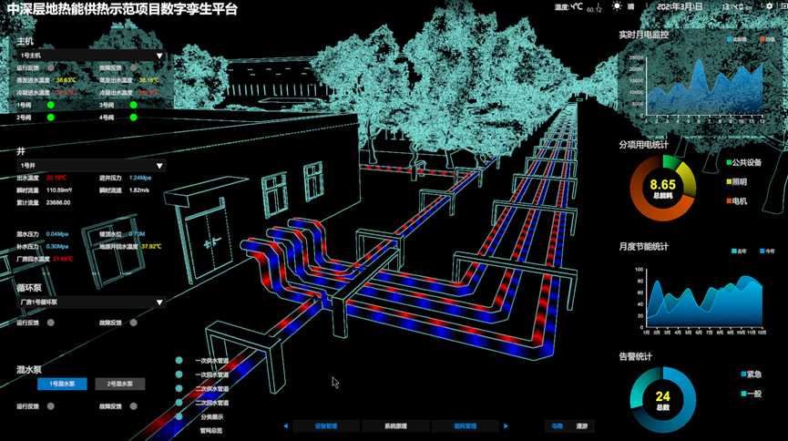 通過此系統(tǒng),可以利用數(shù)字孿生的靈活優(yōu)勢,將地熱能供暖的原理與實際應(yīng)用數(shù)據(jù)相結(jié)合,并提供直觀的數(shù)字化展示和操作方式,提高了管理效率,為數(shù)據(jù)化驅(qū)動的智能生活與辦公提供了堅實的基礎(chǔ)。