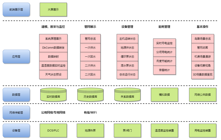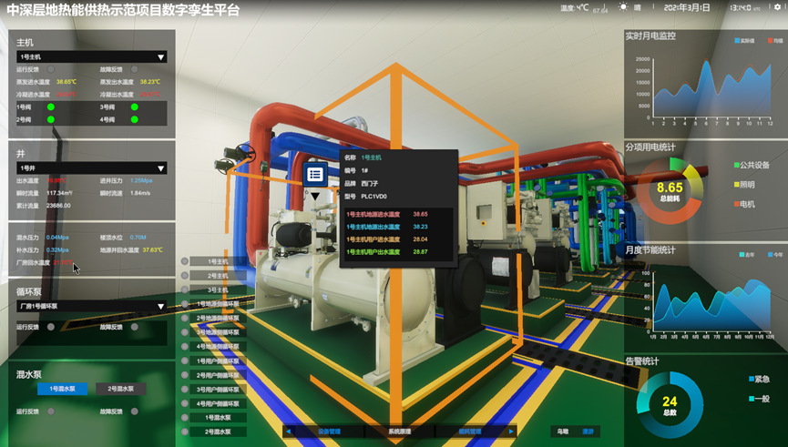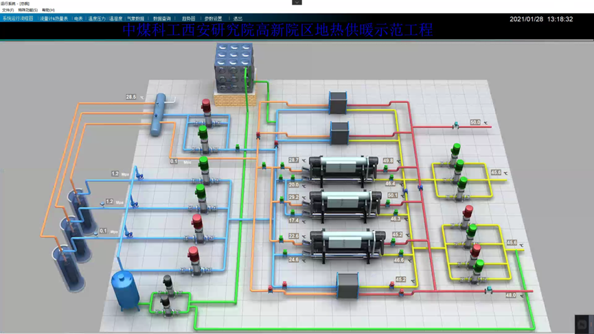 本軟件通過對中煤科工西安研究院地熱供暖泵房、主辦公樓及周邊輔助建筑物的供暖制冷需求搭建高精度1:1三維模型和工藝數(shù)學模型,通過三維可視化監(jiān)控界面實現(xiàn)主要供暖、制冷區(qū)域的溫濕度監(jiān)測,及泵房主要設(shè)備溫度、流量、壓力等運行參數(shù)監(jiān)控;結(jié)合工藝數(shù)學模型仿真計算結(jié)果、提供運行控制參數(shù)合理化建議;整個系統(tǒng)具備歷史數(shù)據(jù)查詢、分析、能耗管理、仿真培訓、設(shè)備運行參數(shù)優(yōu)化等功能,該項目的成功實施起到了推廣數(shù)字孿生平臺應(yīng)用、促進兩化融合的先進示范效應(yīng)。