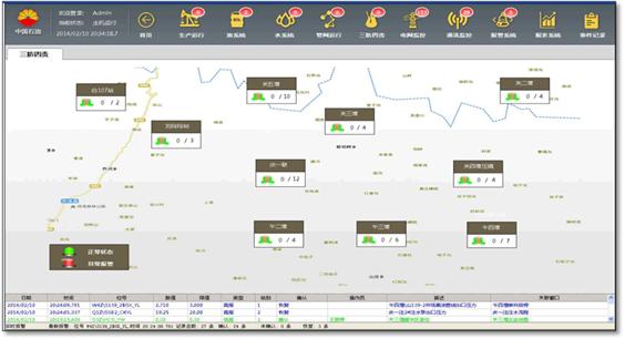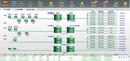 水系統監控重點監控注水干線、注水閥組、水源井,以總引導界面進入不同的注水站、水源井監控界面、注水井配注界面。