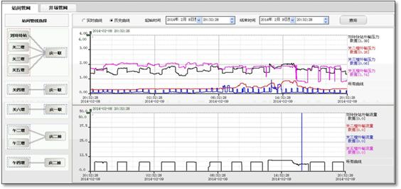 管理運行主要包含站間管線監測以及井場管線監測,主要以實時與歷史曲線方式體現。 站間管網曲線重點對各站點對點集輸或插輸管線的流量、壓力實時監測,井場管線重點以井場回壓實時監測。