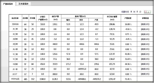 生產運行主要包括產液量監控與注水量監控,產量液量監控主要體現全區所有站的開井數、計劃產量、前日產量、當日輸出、當日庫存、當日產進量、功計產量、產量進度數據。 油井產量分析界面重點體現增壓站所管轄井場各油井當日產量、昨日產量、井場產量、較昨日差值、油井狀態、工況分析結果、功圖分析、原因分析。 注水量監控主要體現昨目注水量、當日注水量、折算配注量、以及配注差、配注進度。水井產量分析主要體現各站閥組的分壓、管壓、日注水量、日配注量、瞬時流量、累積流量、水井配注。