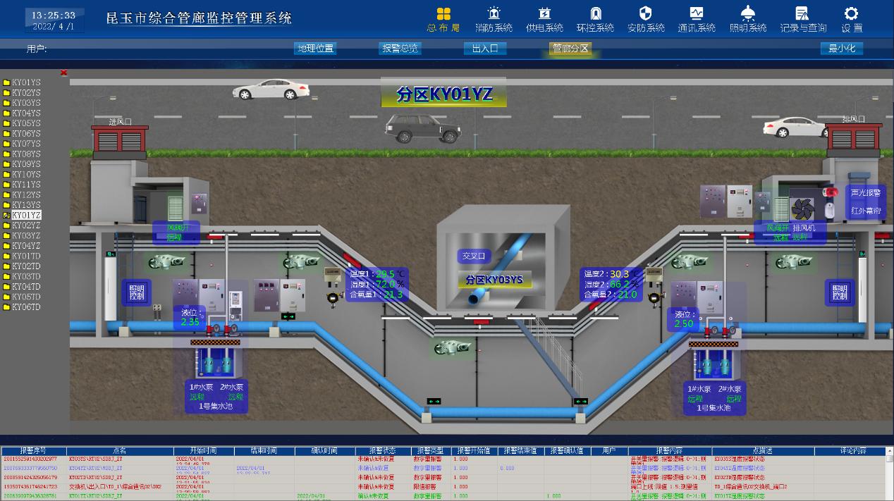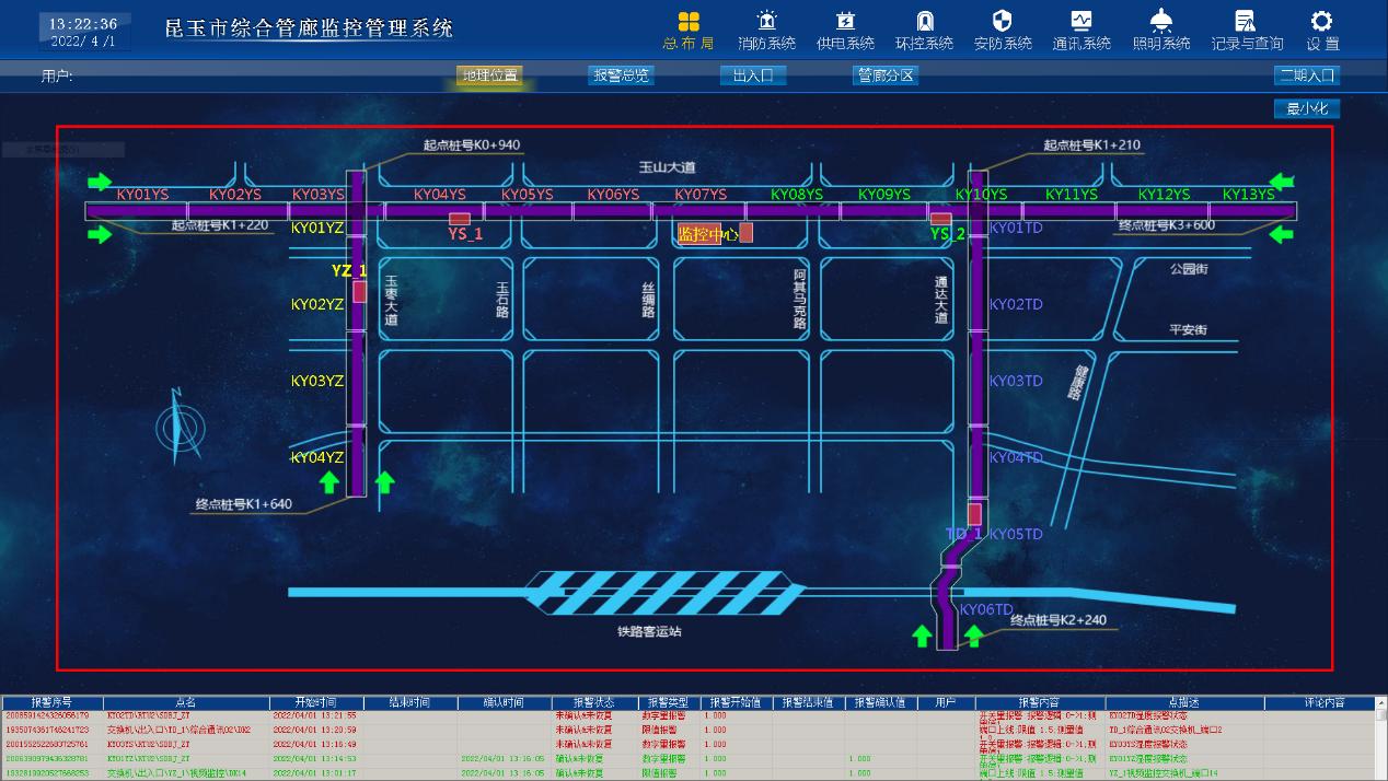 通過3D模型的方式展示綜合管廊監控中心、防火分區、設備間地理分布圖和重要設備地理分布圖如管道閥門,在地圖上展示系統區域主要運行信息,并顯示鼠標靠近區域詳細運行信息,單擊鼠標切換對應區域的詳細工藝畫面或功能畫面。 當發生管道泄漏、非法入侵、發生火災、設備運行異常等報警時,系統迅速對報警發生的防火分區或設備間進行定位,在地圖上對應區域進行警示性閃爍,同時結合報警聲音,提醒值班人員進行報警處理。