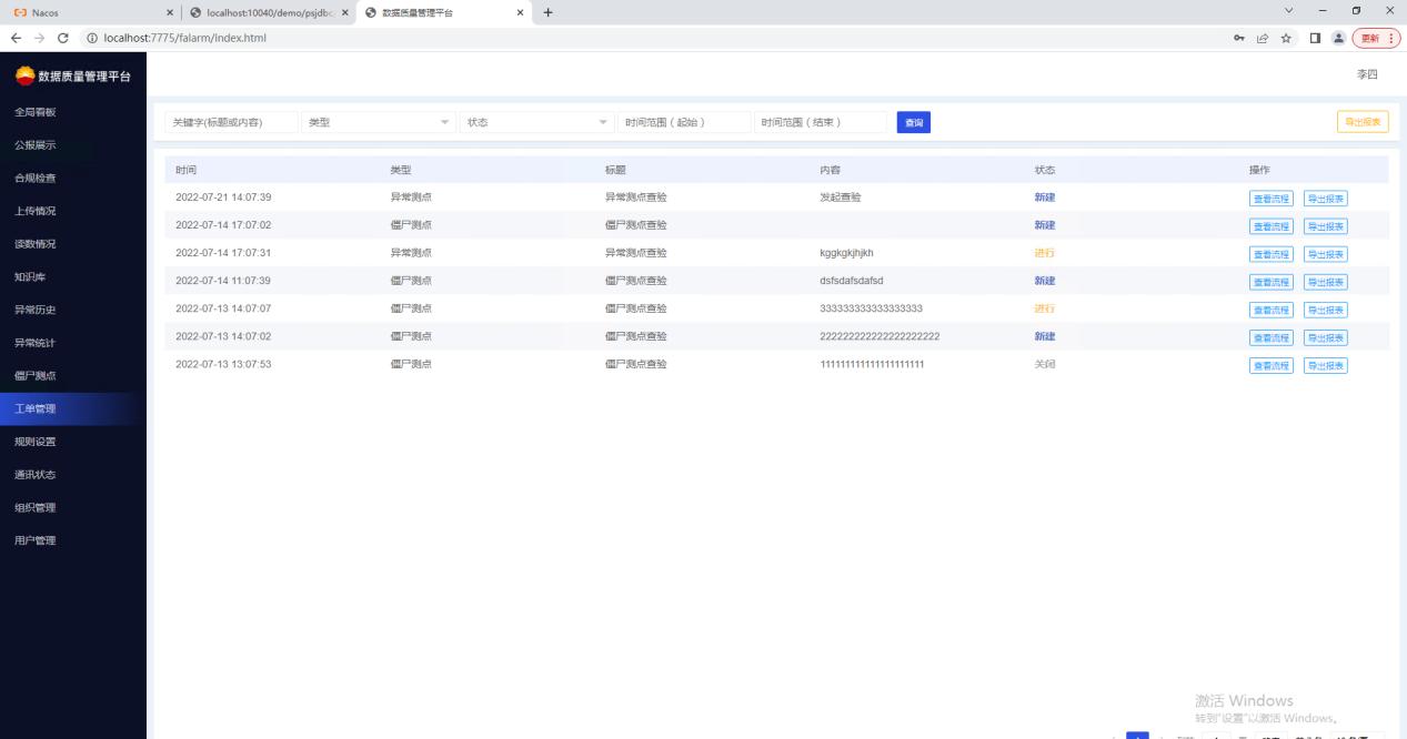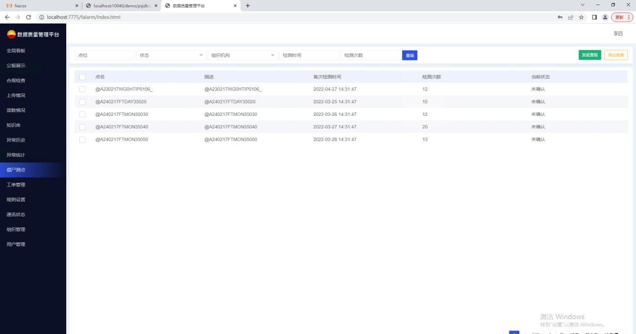 僵尸測點的來源通過定下的規則,判斷為僵尸測點后,顯示在“僵尸測點”的界面中,界面展示了該測點的點名、描述、首次檢測時間、檢測次數和當前狀態??赏ㄟ^左上角查詢條件查詢出一個時間段的僵尸測點。