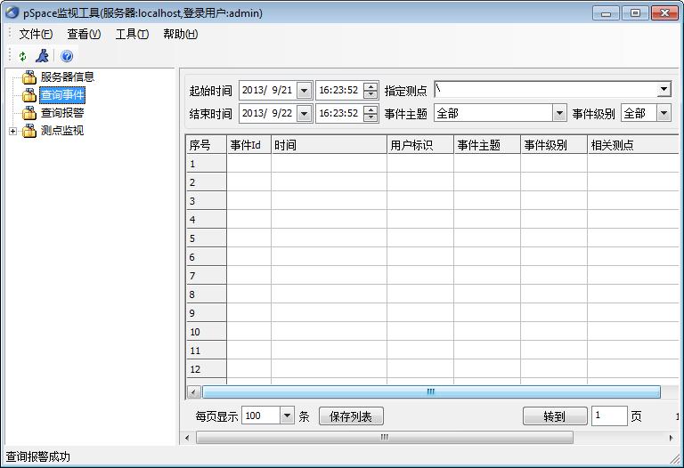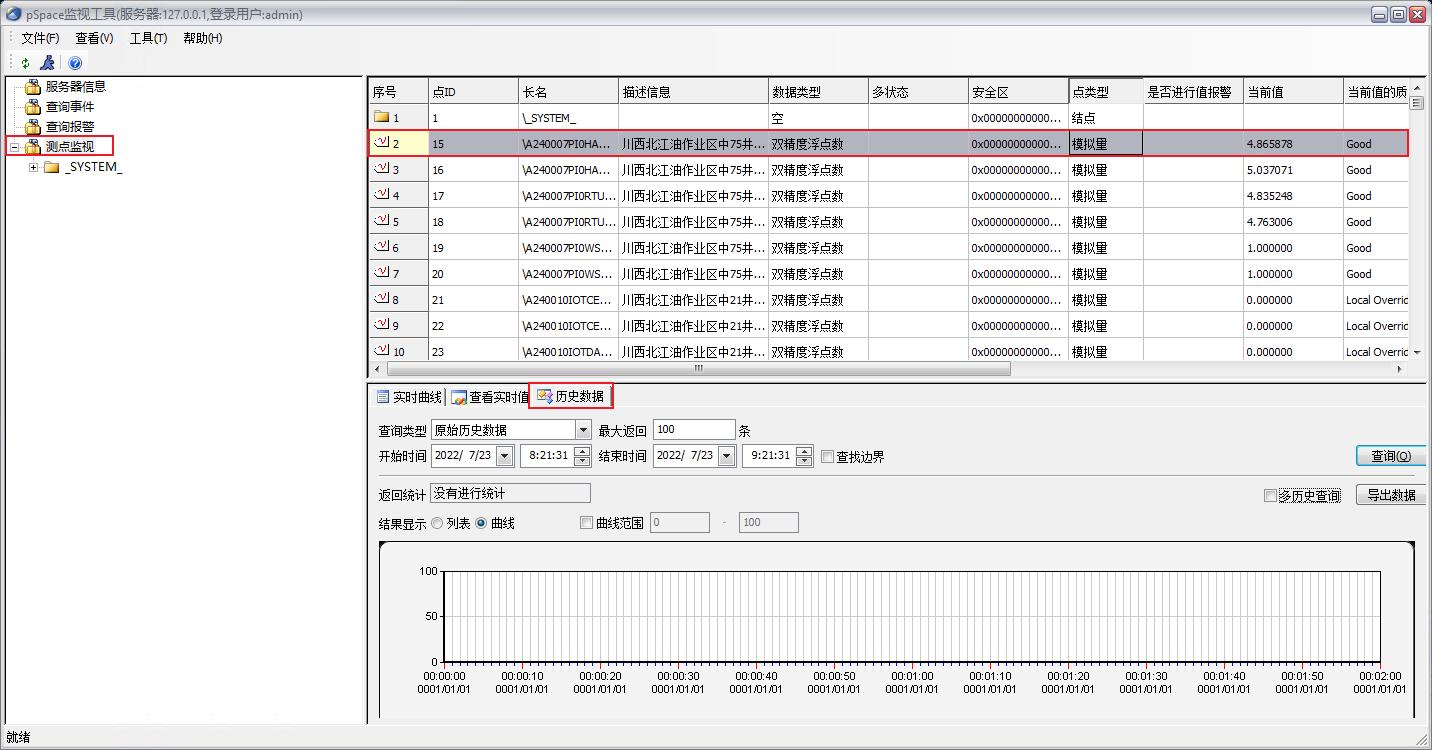 同樣使用pSpace管理工具psMonitor也可以對選中測點進行歷史數據查詢,選擇好開始時間、結束時間、查詢類型,點擊“查詢”按鈕,歷史數據就會以列表或曲線的方式在下方顯示。