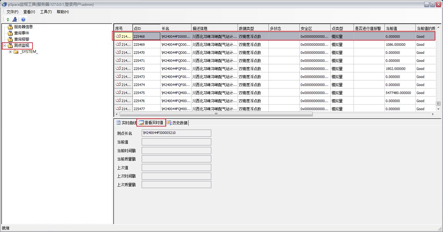 系統將下方各二級單位提供的現場實時生產數據進行實時匯總倒當前實時數據庫,可以使用pSpace管理工具psMonitor來對下方的數據進行的實時的查看,查看當前數據的質量狀態,以及時間戳等重要數據。