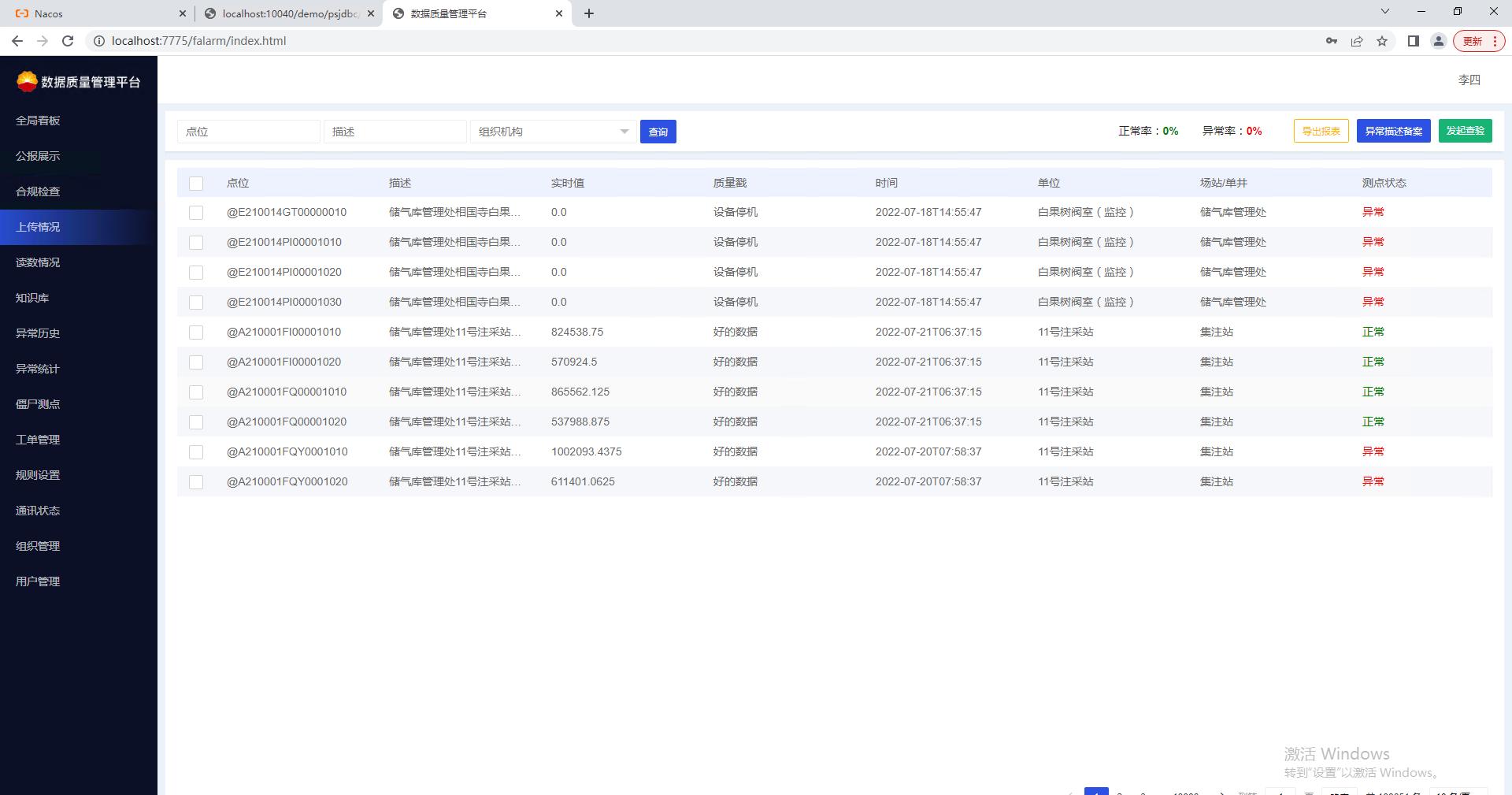 上傳情況上顯示當天新增測點的情況,按照創建的時間進行排序,最近的創建靠在最前面。 “上傳情況”包含對每個點異常情況進行統計,默認展示當天的異常統計情況,能查詢某段時間異常查詢的功能。在左上角查詢條件處包含“點位”、“描述”、“組織機構”查詢出我們需要的點; “測點狀態”查詢,可對“正?!焙汀爱惓!睌祿c進行區分,對異常數據點可以一鍵實現“異常測點備案”和“發起查驗”操作。