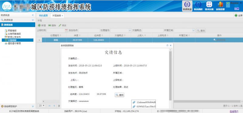 汛情發生后,通過已被調度的各個模塊來對事故進行處理,合理安排泵站的抽排水、搶險車輛和搶險隊伍等對人員物資的搶救,按照應急預案有條不紊的應對各種突發事故。對已經完成的搶險救災任務形成簡報,地圖展示位置信息,可查看處理結果,對搶險救災任務進行總結,用最優的措施保障人民生命財產安全。