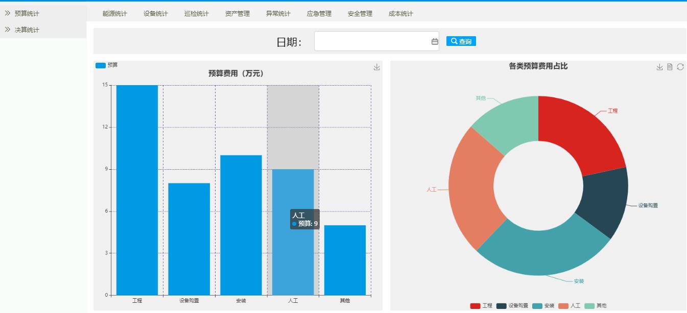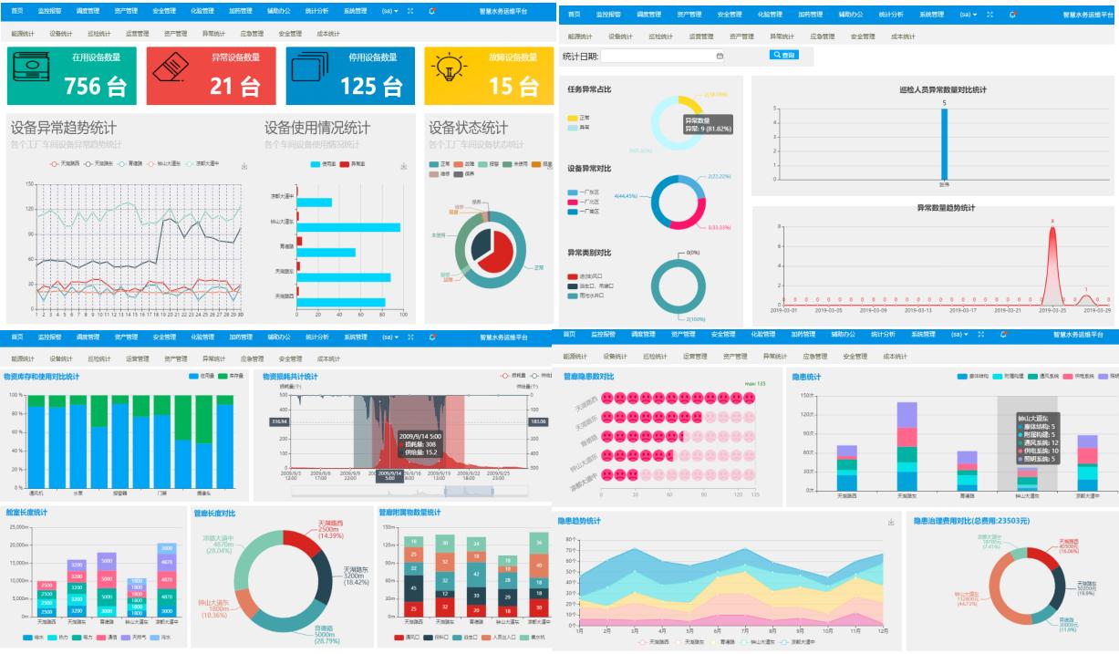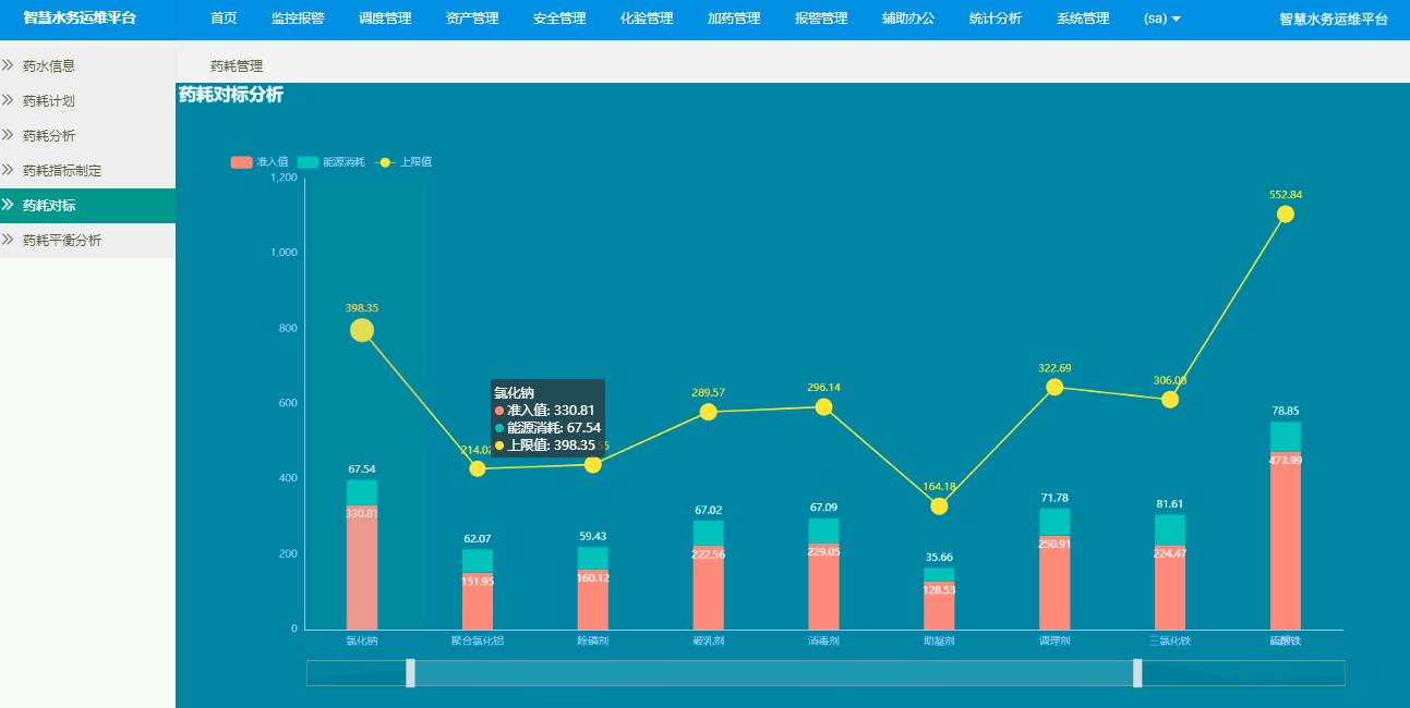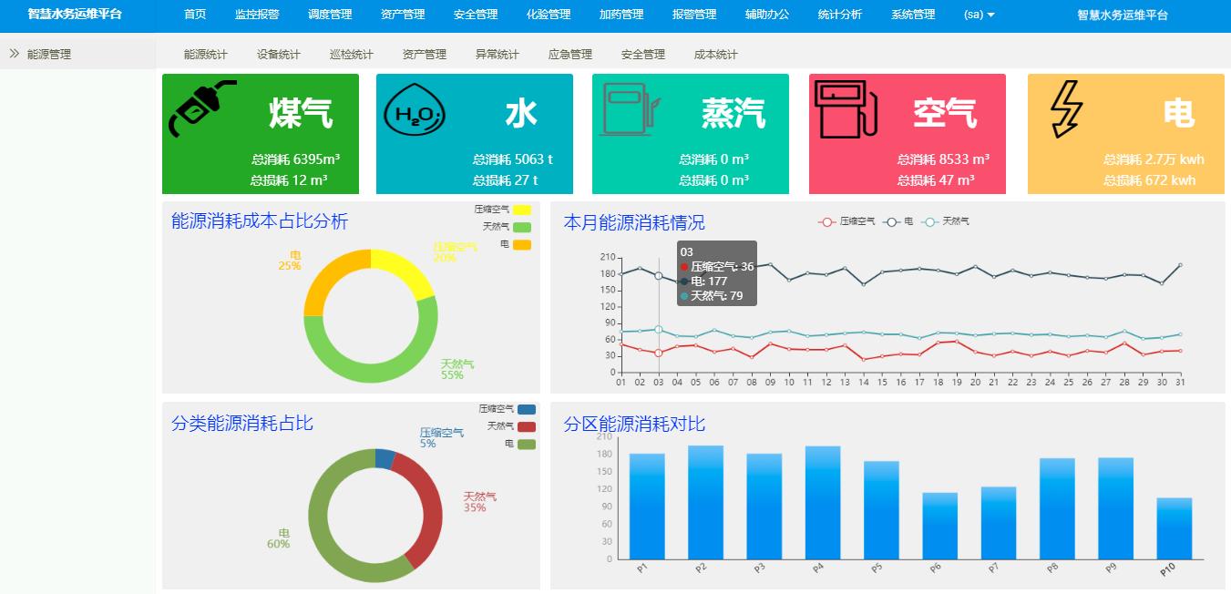 建立藥耗控制與分析系統(tǒng),可根據(jù)采集的信息提前計(jì)算生產(chǎn)需要的碳源、PAC等藥劑的投加量,加藥前后指標(biāo)變化趨勢,并進(jìn)行加藥自動控制,并可分析出任意時(shí)間段內(nèi)各單元的藥耗,生成日報(bào)、月報(bào)、年報(bào)??蓪?shí)現(xiàn)對藥耗生產(chǎn)運(yùn)行成本進(jìn)行分析控制和藥劑管理。對用能分類分項(xiàng)進(jìn)行同環(huán)比分析,以棒圖、餅圖、報(bào)表等形式展示,讓用戶更直觀、快速地了解藥耗信息。