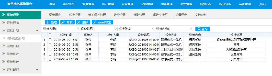 在系統(tǒng)中可根據(jù)巡檢的路線及巡檢的內(nèi)容,生成不同版本的水務(wù)巡檢計(jì)劃用例,安排工作人員通過手機(jī)APP執(zhí)行巡檢計(jì)劃用例,按照巡檢路線及巡檢項(xiàng)目內(nèi)容進(jìn)行巡檢工作。 系統(tǒng)根據(jù)巡檢任務(wù)執(zhí)行和巡檢反饋形成巡檢記錄,并對巡檢結(jié)果進(jìn)行執(zhí)行確認(rèn)評估。 系統(tǒng)使用人員可根據(jù)計(jì)劃時(shí)間、巡檢任務(wù)等進(jìn)行巡檢查詢。