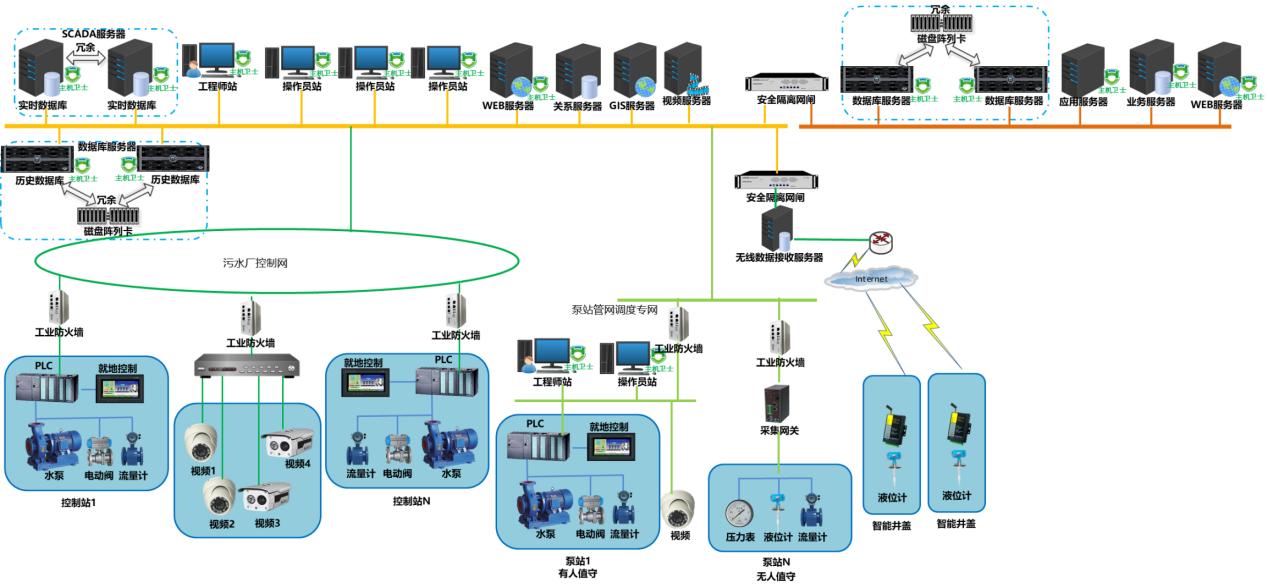 系統(tǒng)主要是調(diào)度及信息中心系統(tǒng)。硬件包括實(shí)時(shí)服務(wù)器(熱備冗余)、歷史服務(wù)器(熱備冗余)、磁盤陣列柜、Web服務(wù)器、視頻監(jiān)控系統(tǒng)、工程師站、操作員站(根據(jù)監(jiān)控站場數(shù)量調(diào)整)、視頻工作站、大屏顯示系統(tǒng)、打印機(jī)、UPS電源、網(wǎng)絡(luò)設(shè)備等;隔離網(wǎng)關(guān)、主機(jī)衛(wèi)士等安全設(shè)備保證系統(tǒng)信息安全。