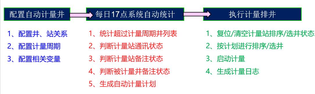 常規(guī)的計量方式需要先完成計量計劃的制定,然后向計量人員下發(fā),計量人員按照紙質(zhì)計量計劃單進行手動選井計量,單手動選井計量的工作就需要1~2人每天花費30分鐘以上的時間才能完成,且不保證存在人為疏忽的可能性。本次開發(fā)的自動計量功能,最終可實現(xiàn)人工預配置單井計量周期,系統(tǒng)每日17點自動進行統(tǒng)計哪些井超過預定時間,系統(tǒng)自動將超過預定時間的井進行排井計量。