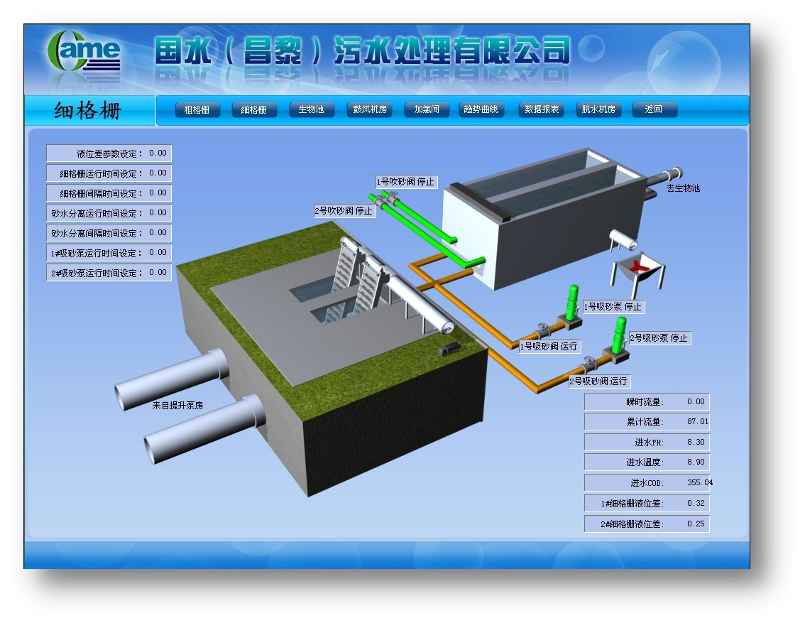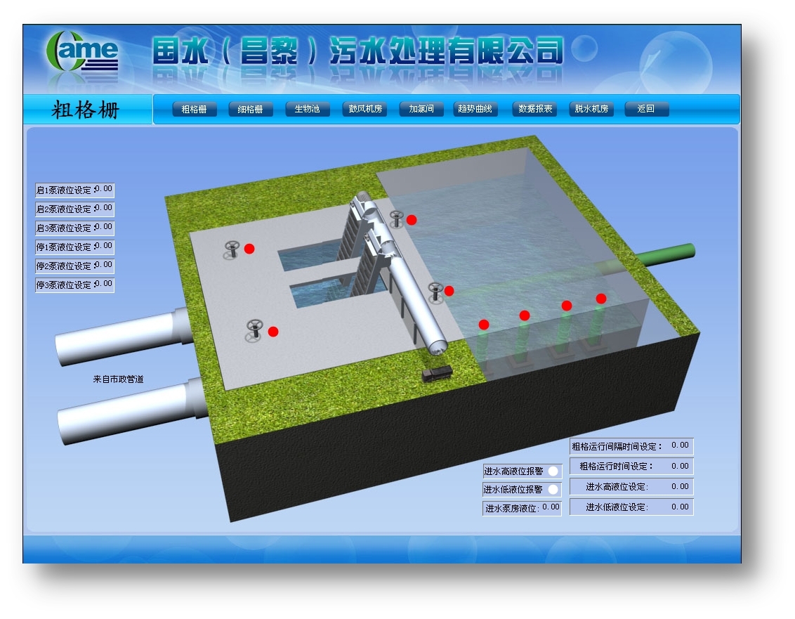 爬式粗格柵,進水經過粗格柵間過濾一些大的固體雜質,去除那些可能對水泵有影響的無機物。需要監測格柵水位差、進水流量、進水酸堿度、進水COD、提升泵狀態等參數。