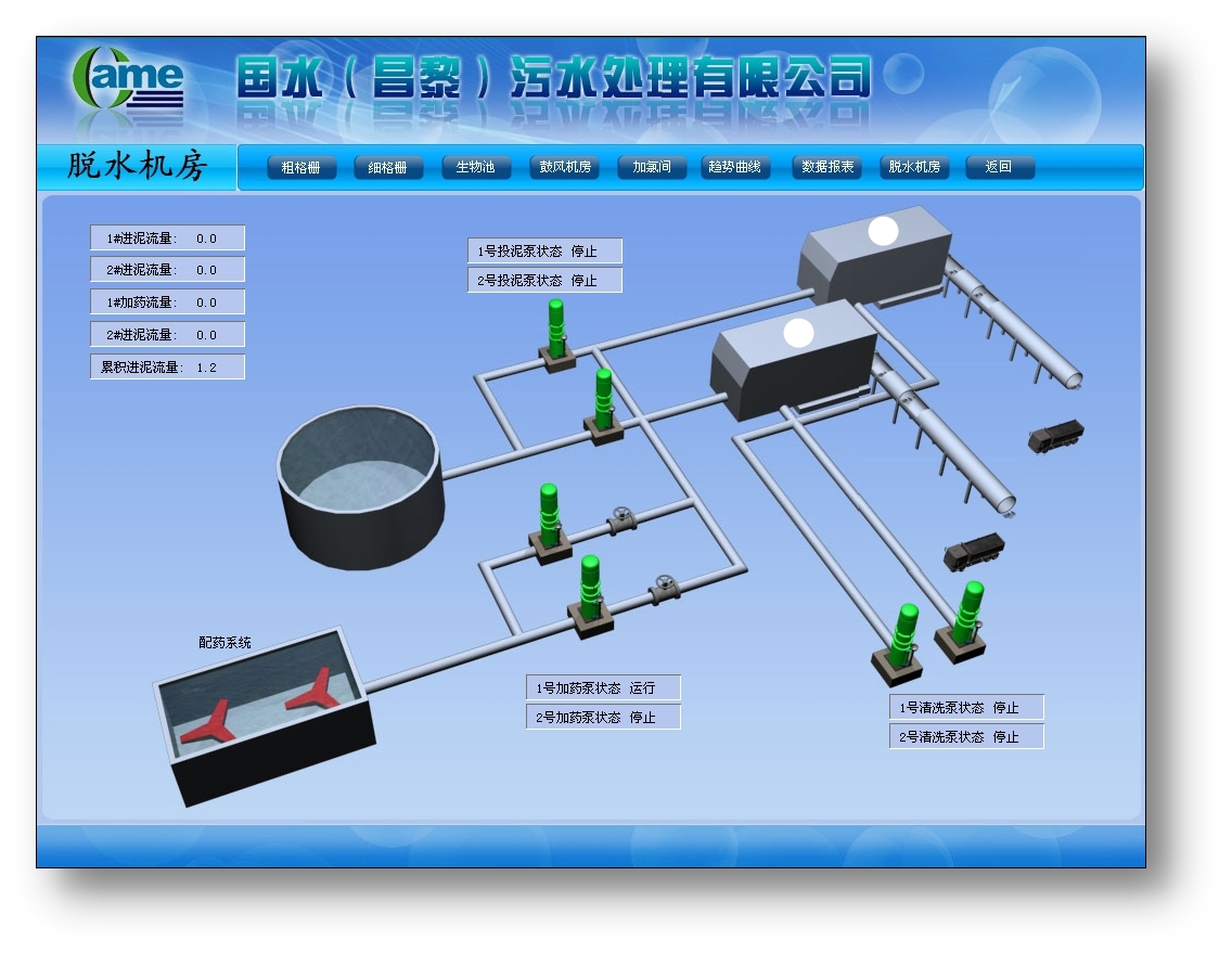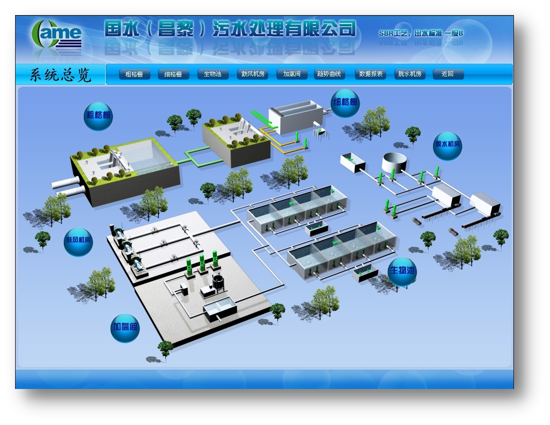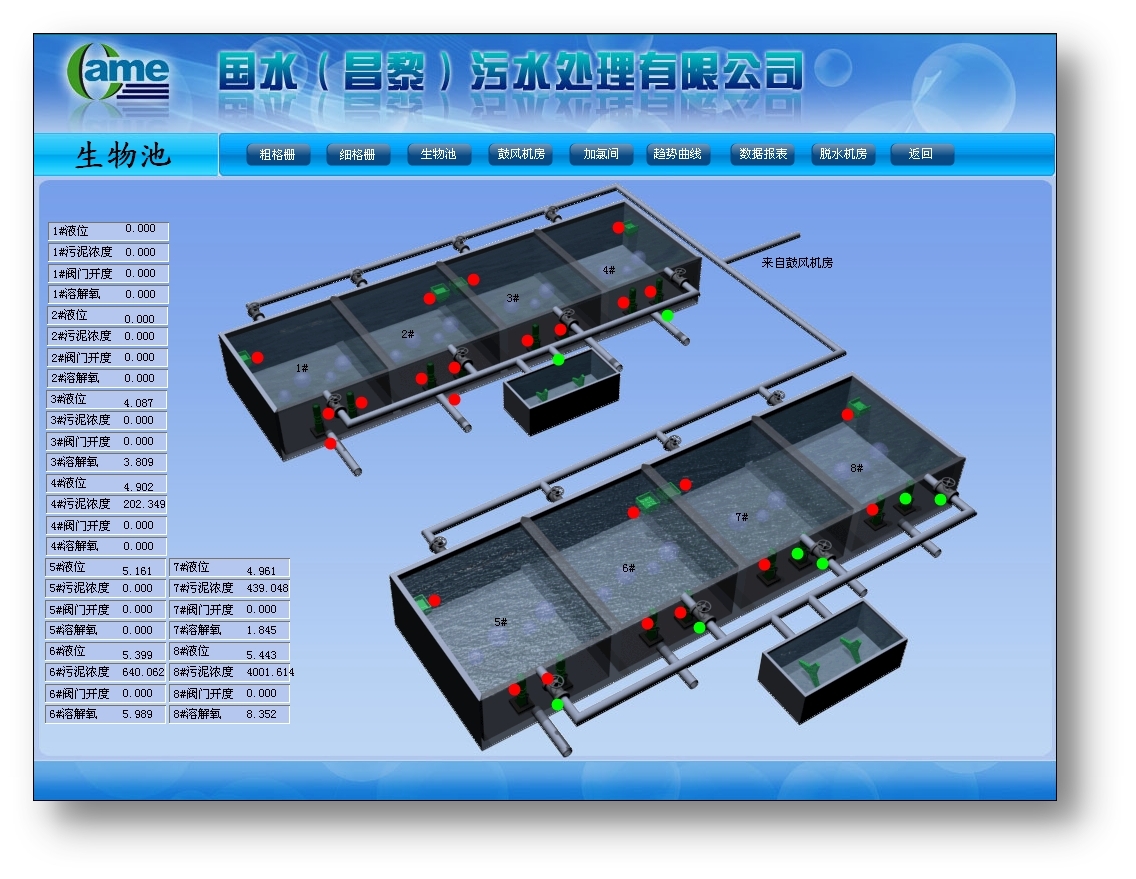 系統以美觀、友好的界面顯示設備運行狀態、流量、水位、COD、超聲波液位計、溶解氧計、氧化還原電位計、污泥濃度計、電磁流量計等數據,并以仿真圖、直方圖、曲線圖和棒圖等多種方式清晰直觀地顯示各個敏感數據,方便用戶對各敏感數據進行歷史查詢和對比分析。