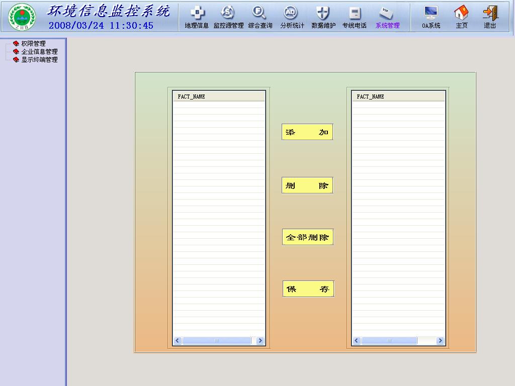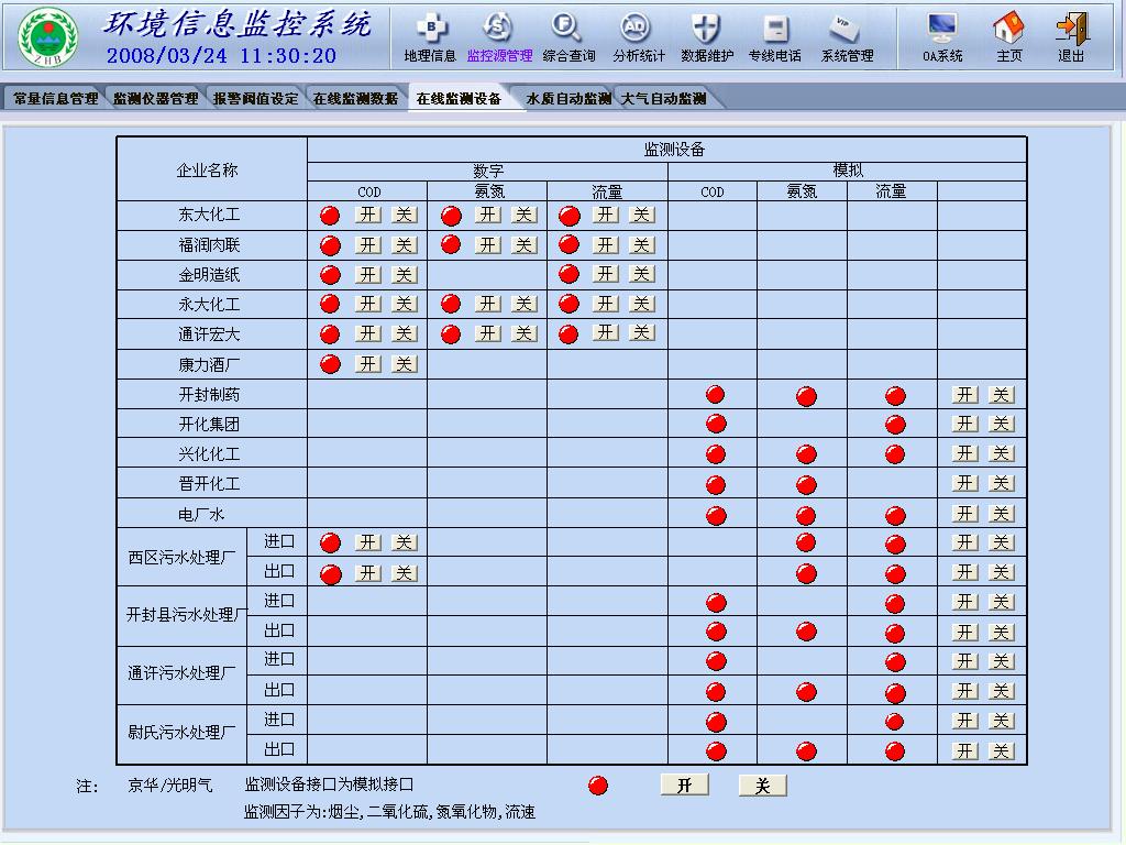 施管理;在線監(jiān)測儀管理可以動(dòng)態(tài)添加排污口,采集儀,各種模擬設(shè)備和開關(guān)設(shè)備,并可以指定模擬設(shè)備的標(biāo)準(zhǔn)數(shù)值和報(bào)警的上下限。