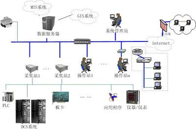 采集系統分為服務器和客戶端,服務器可采用RTDB進行采集,主要功能有:工業現場實時數據采集、數據歷史保存、報警數據的存儲;客戶端主要完成實時數據顯示、歷史數據查詢、報表查詢、報警信息查詢、報警處理、故障排除、曲線和棒圖繪制。電廠采集系統可以與企業的MES等系統連接。如下圖:
