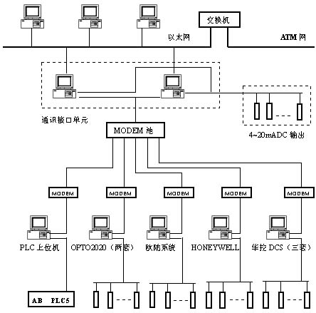 數據采集管理系統在全公司計算機綜合信息管理系統中處于最底層,負責采集生產裝置自動控制系統中的生產實時數據,并將數據傳輸到調度室監控系統主機上,通過圖形畫面顯示輸出。該系統具有趨勢、報警、查詢等功能,使調度人員在調度室內了解全廠各分布區域的生產情況,進行調度管理,也為今后建立全公司綜合信息管理,實現無紙辦公和決策信息支持打下基礎。系統拓撲圖如下:
