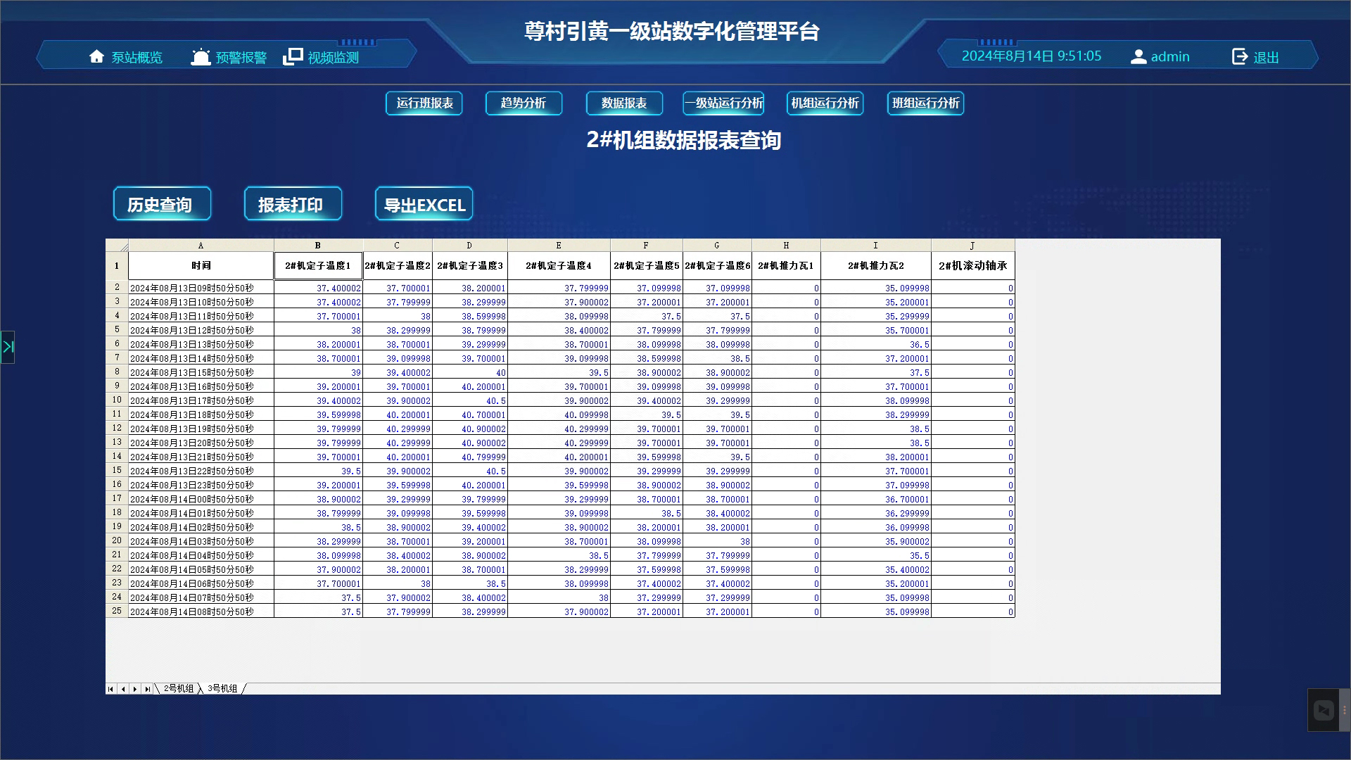 可查詢監測設備的歷史數據,以及機組水位、溫度、電壓等所有監測參數的歷史數據信息,支持打印和導出到本地excel文件。