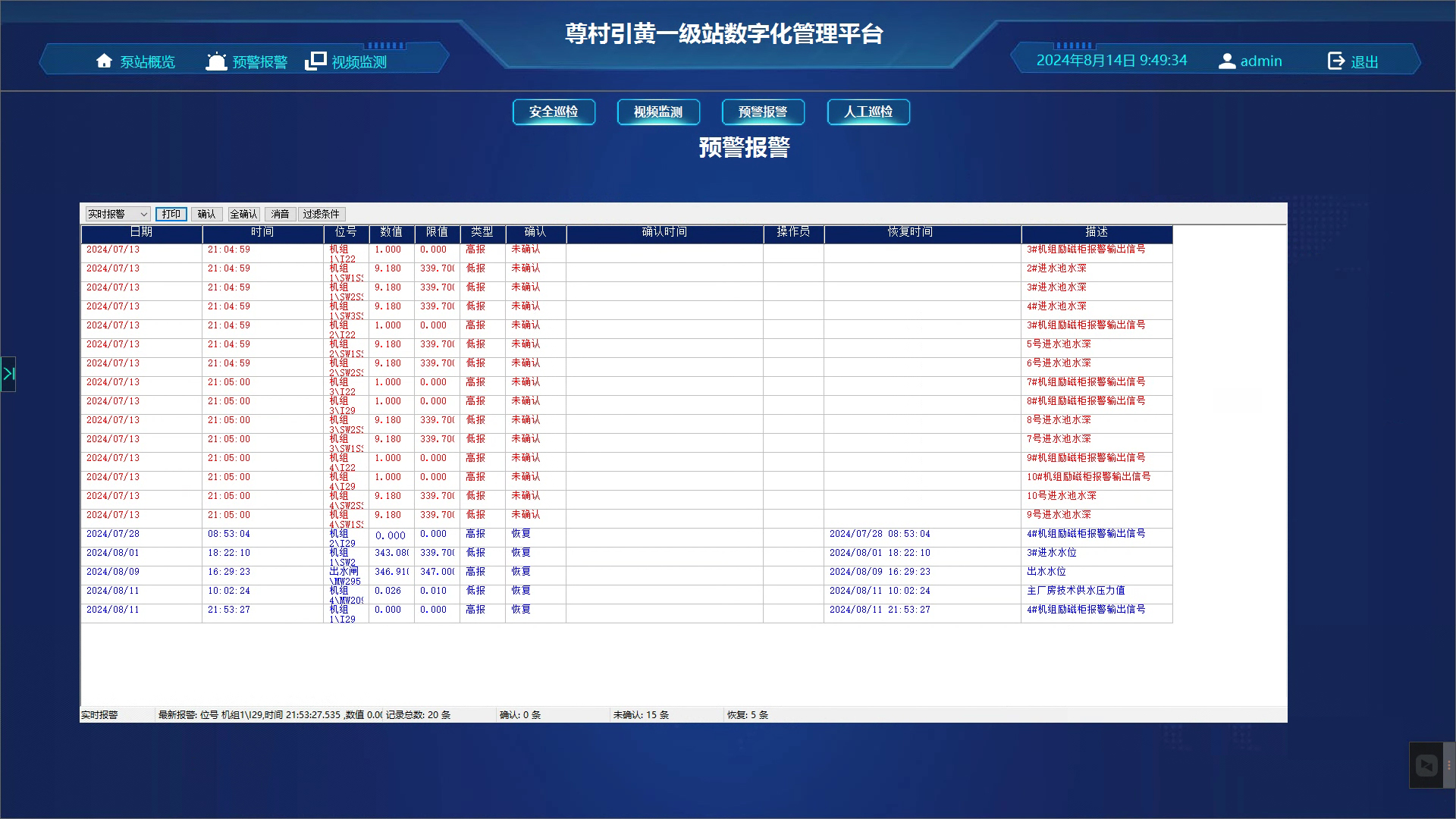 預警報警針對電壓、電流、勵磁數據、電機上下軸瓦溫度、機組振動、機組噪音、技術供水壓力和流量、排水水位、進水水位、流量等參數設定安全閾值,監測實時數據,一旦超出安全閾值平臺將立即報警。監測數據傳輸每5秒更新1次。