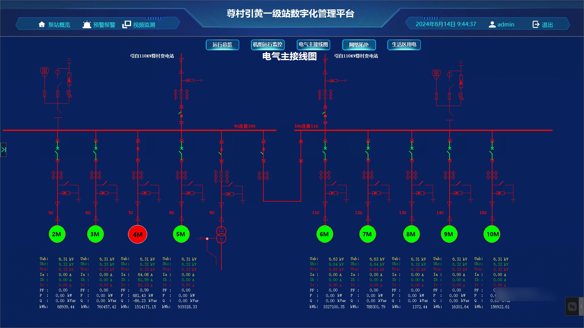 根據一級站電氣主接線情況,采集各開關信號,直觀展現泵站機組設備運行情況,以及高壓分合閘信息和其他電力參數。除此之外,電氣監測還具備故障報警功能。