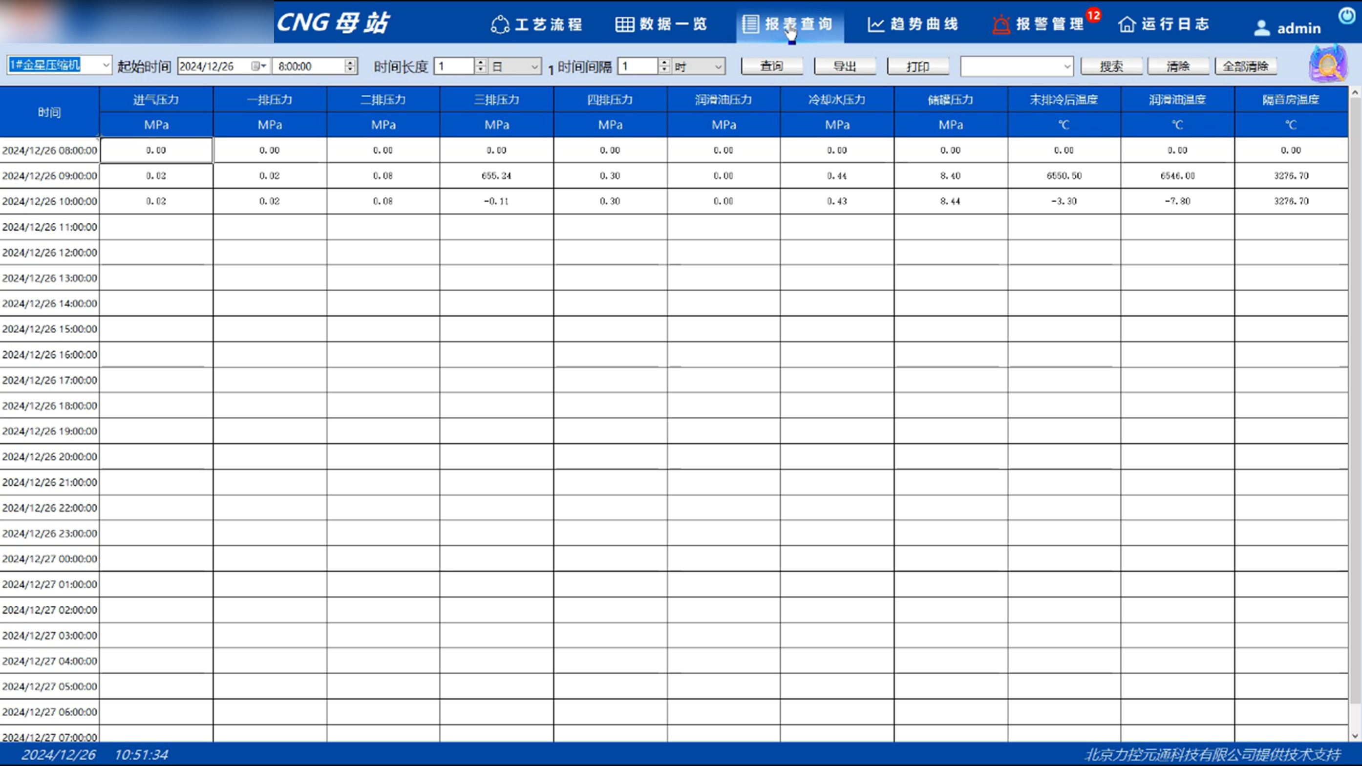 CNG加氣母站站控系統通過集成壓縮機升壓、工藝管道控制、加氣機管理等子系統,實現了天然氣壓縮、凈化、儲存及加注等過程的全面自動化控制,借助遠程數據采集與智能診斷顯著提升生產效率和設備可靠性,有效降低人工操作強度與失誤率。系統支持實時/歷史趨勢圖分析功能,操作人員可通過動態曲線對比歷史同期數據,追蹤壓縮機溫度、壓力等關鍵參數變化趨勢,并可將多組曲線組合保存以便快速調用,助力系統持續優化運行。