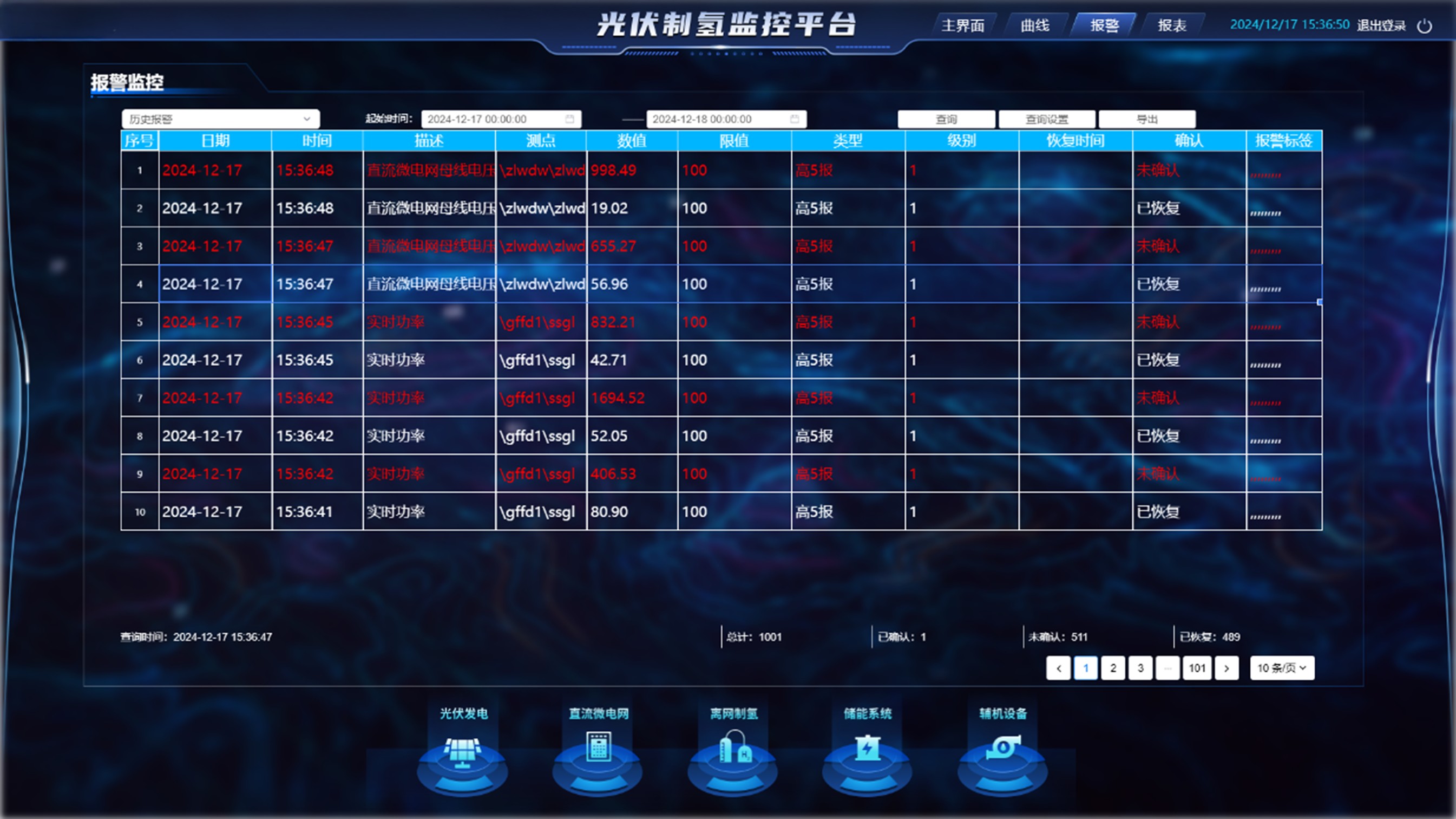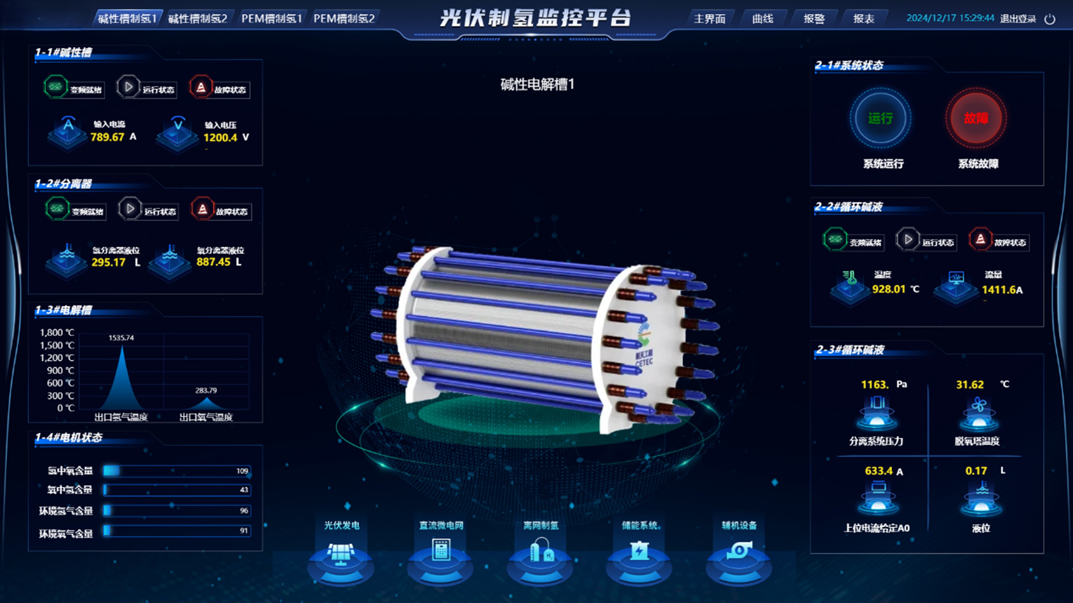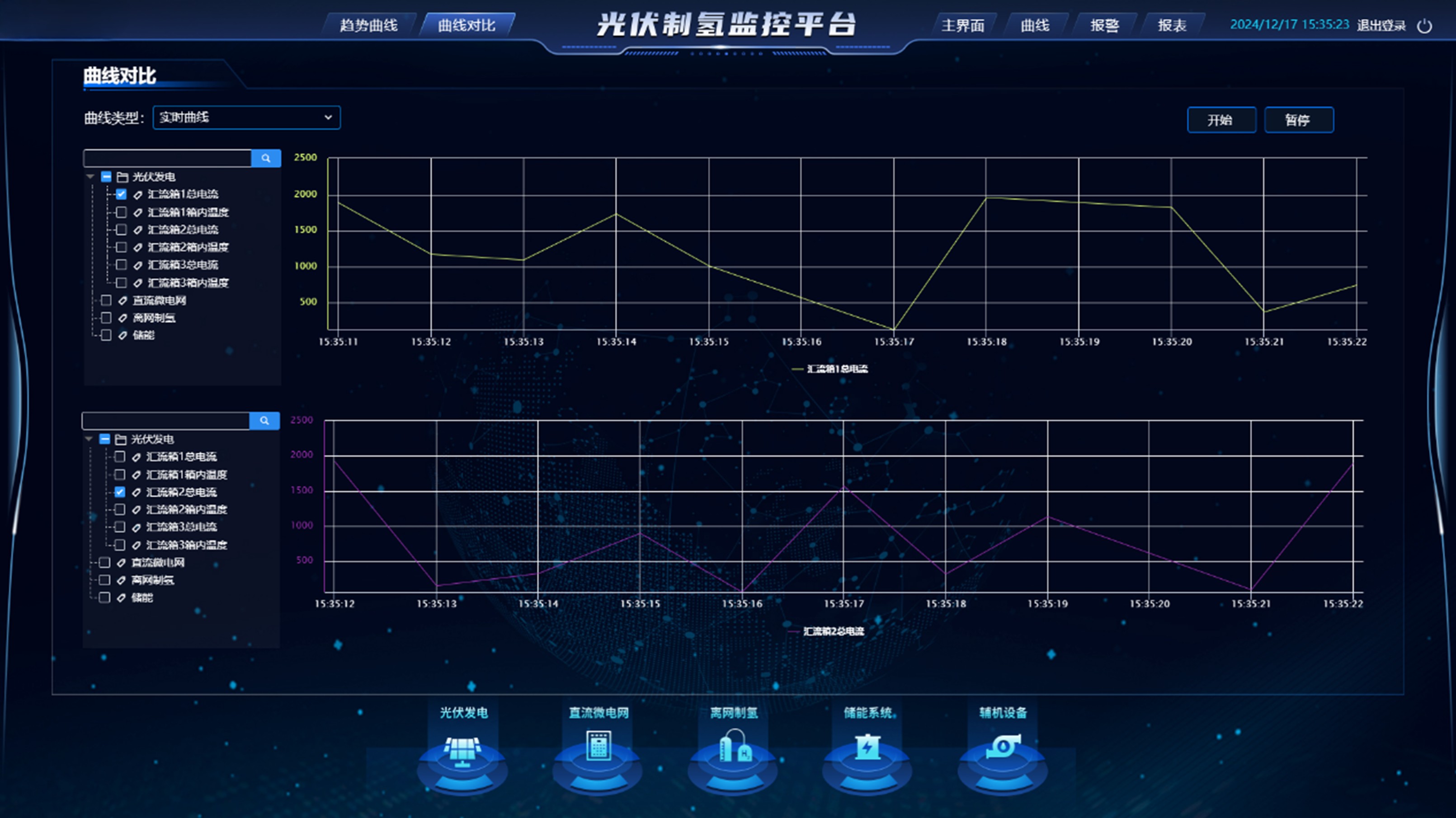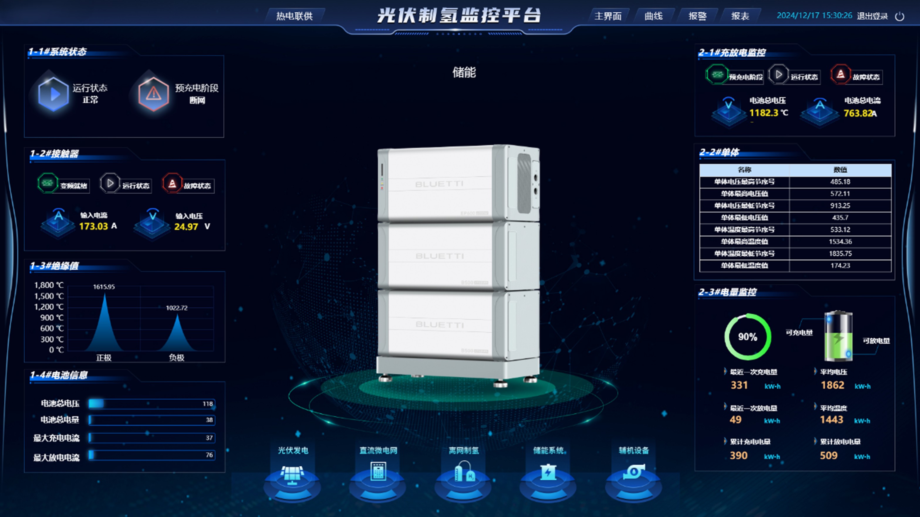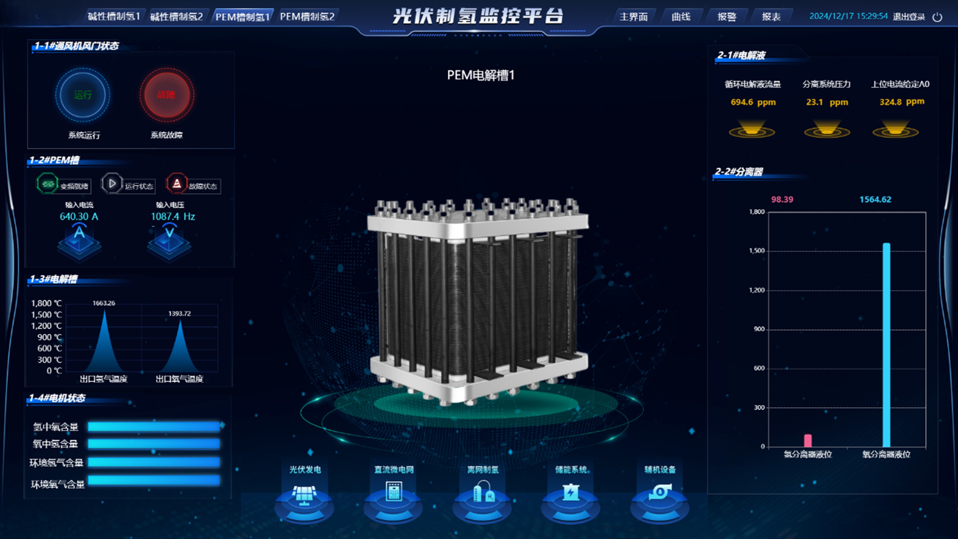 3)離網制氫:跟蹤兩種制氫設備運行狀態、原料消耗、氫含量等數據,支持模式切換與效率分析。