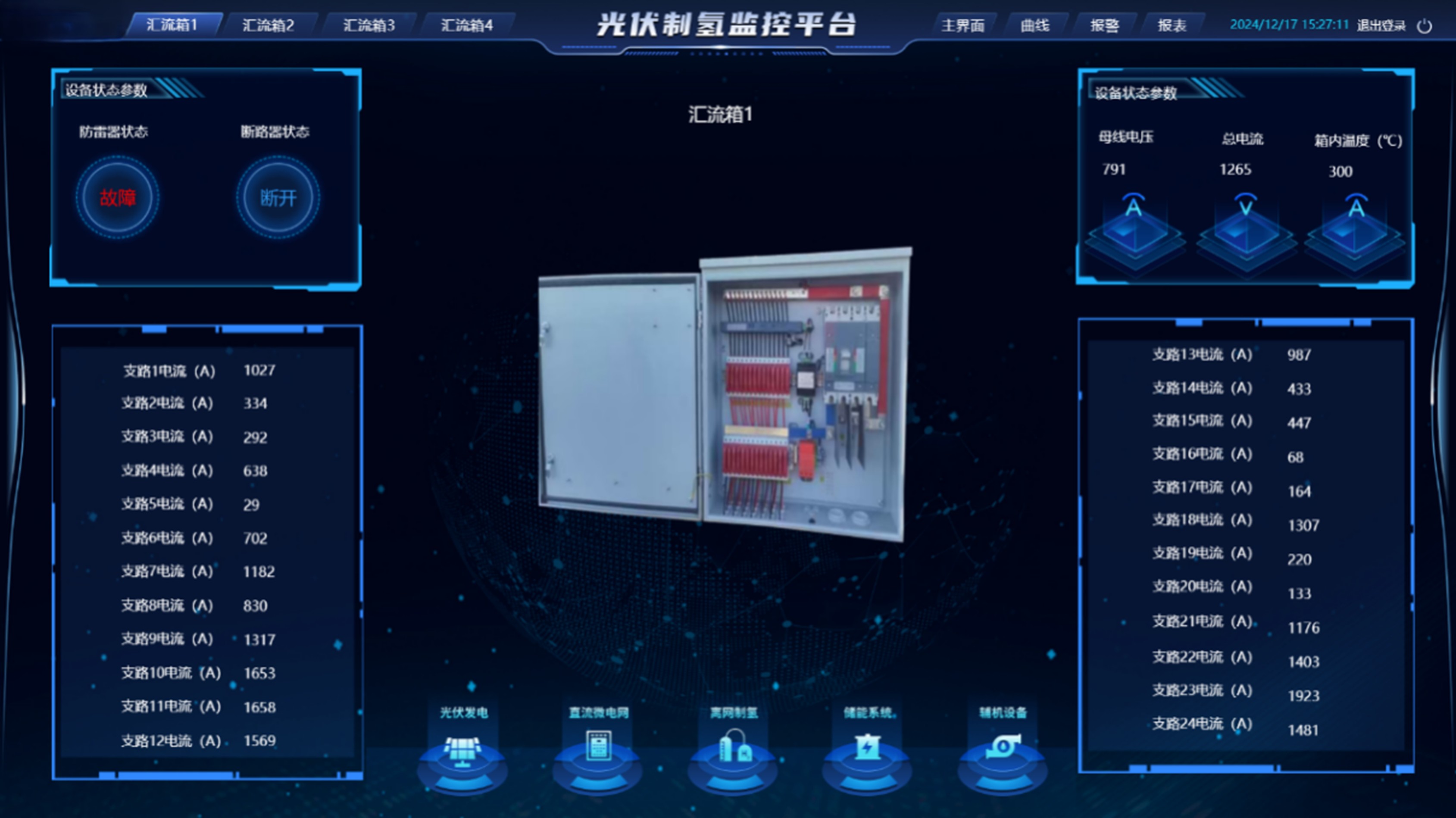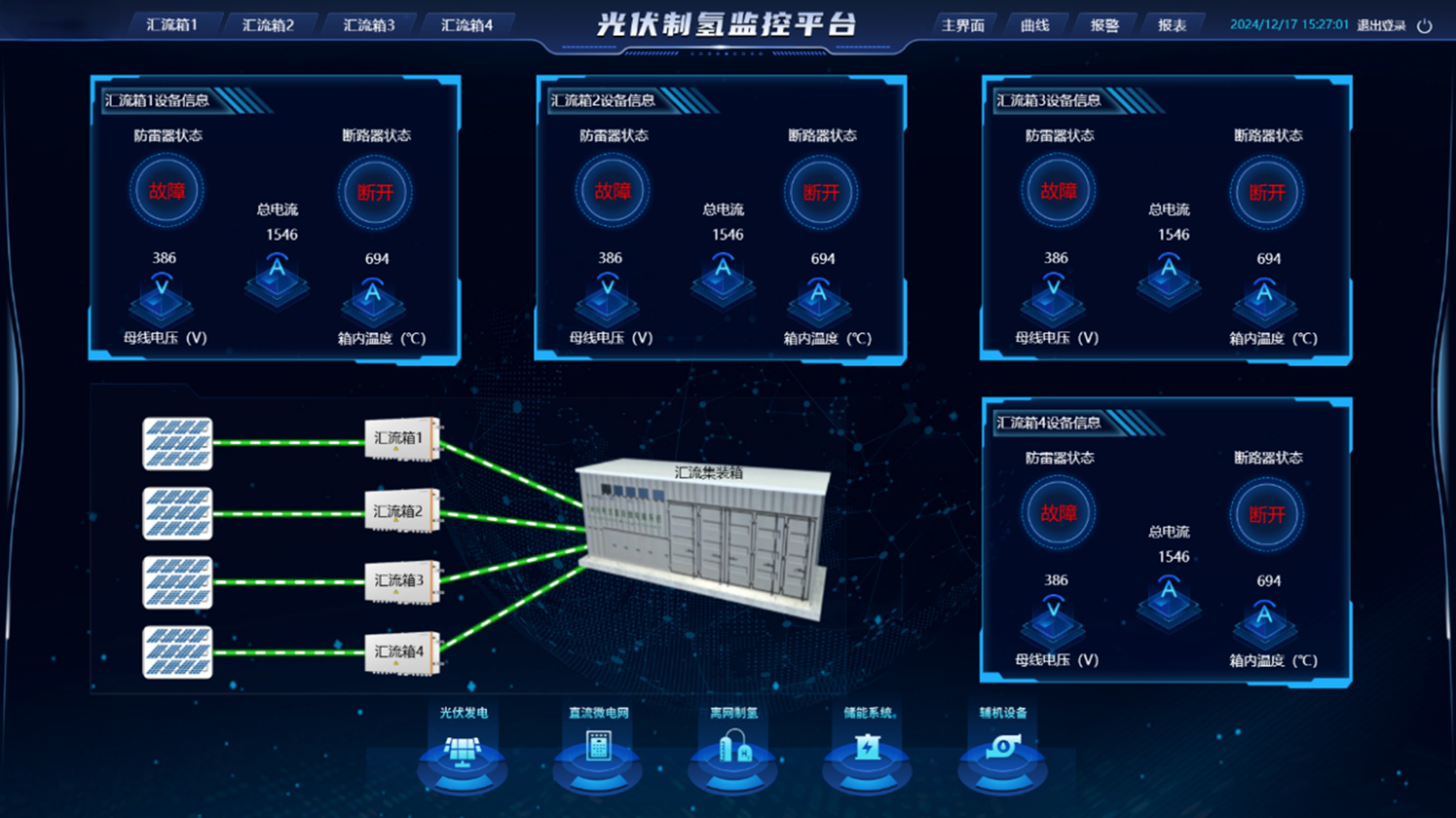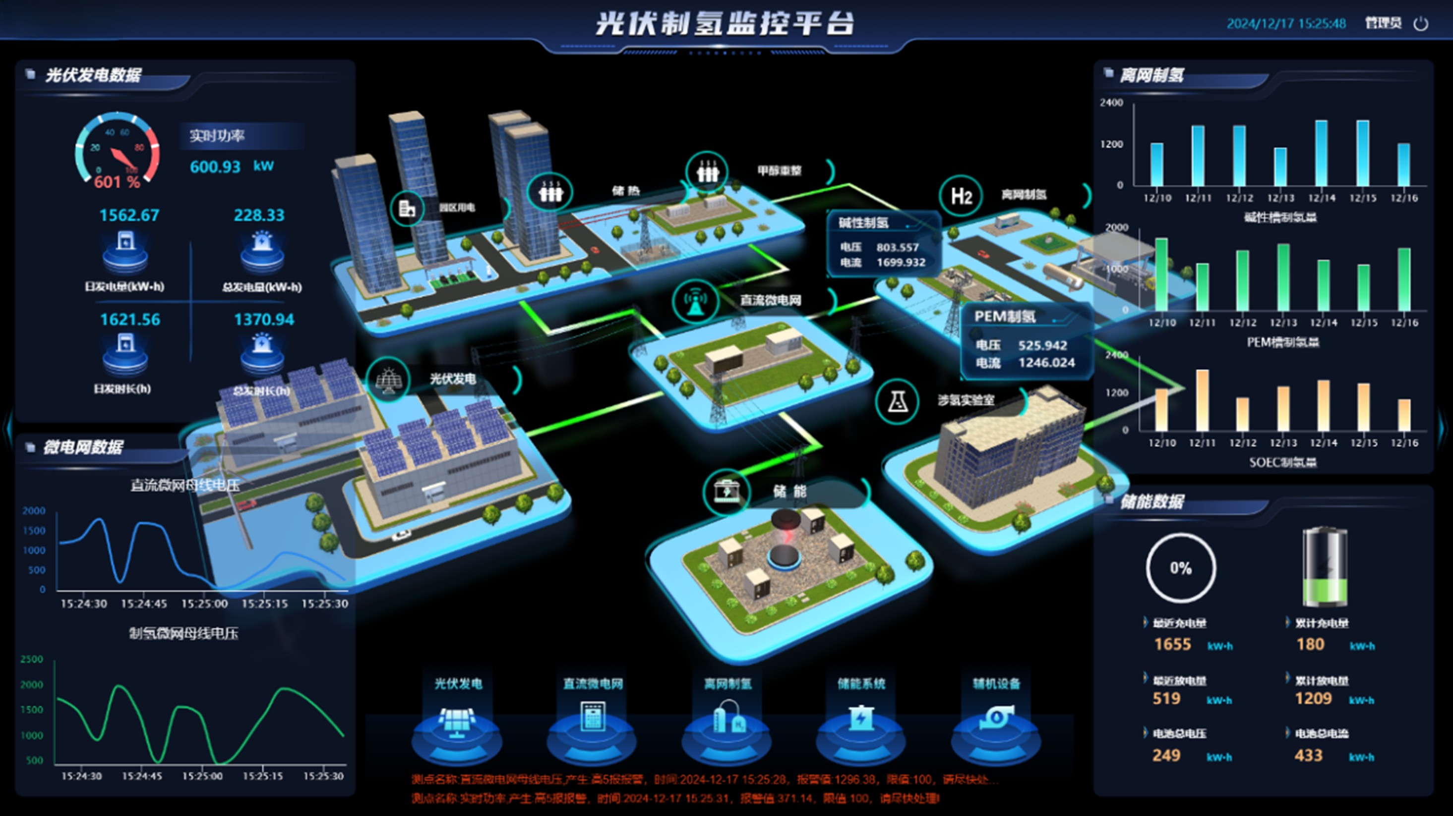 系統通過3D模型直觀展示園區內所有設備分布及連接關系,支持視角旋轉、縮放,動態顯示電流路徑,同時可任意切換至光伏發電、直流微網、制氫、儲能等子模塊,實現全局與局部聯動。
