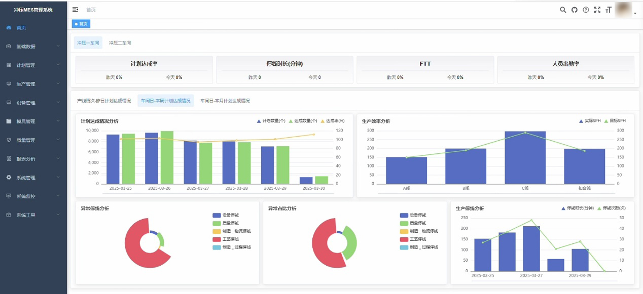 沖壓MES系統不僅提供車間總覽功能,實時展示各項管理指標,還集成生產監控、計劃排程、質量管理、設備管理、模具管理及報表分析等核心模塊,實現全流程數字化管控。
