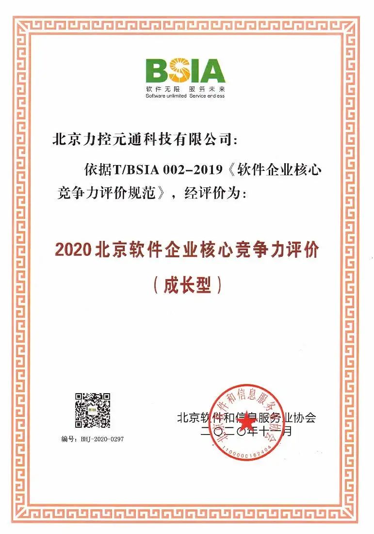 力控科技因其近三年營收年均增長率、人員規模年均增長率、利潤年均增長率明顯高于行業平均水平,在成長速度方面具備核心競爭優勢,最終獲選成為2020北京軟件企業核心競爭力評價(成長型)企業。