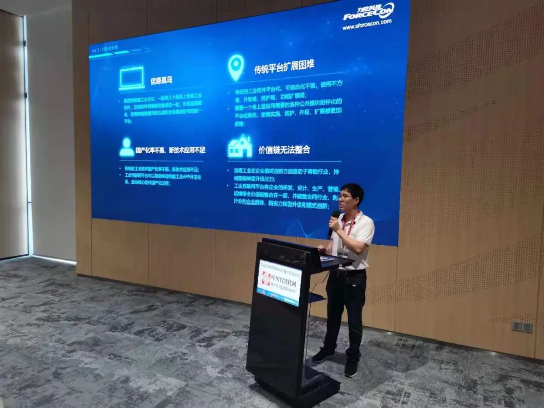 圖為力控元海副總李建強先生出席“工業互聯網的創新應用與發展論壇”并發表“數字孿生”主題演講