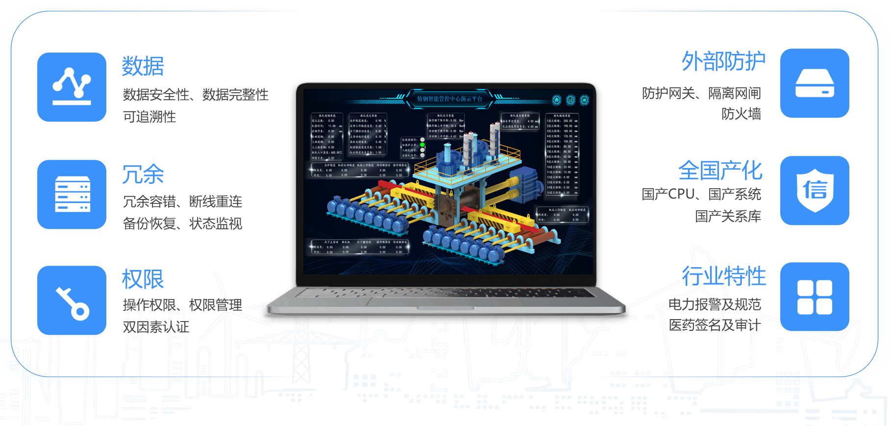 從產業鏈安全角度看,SCADA平臺支持全國產化技術棧,與主流操作系統、CPU及主機、PLC等設備廠商完成了兼容認證,可在異構平臺混合交叉部署。從外部防護角度看,力控科技關注工控系統本質安全,依托自主的工業防火墻、安全隔離網關、安全審計等防護產品形成了成熟的工控信息安全方案。