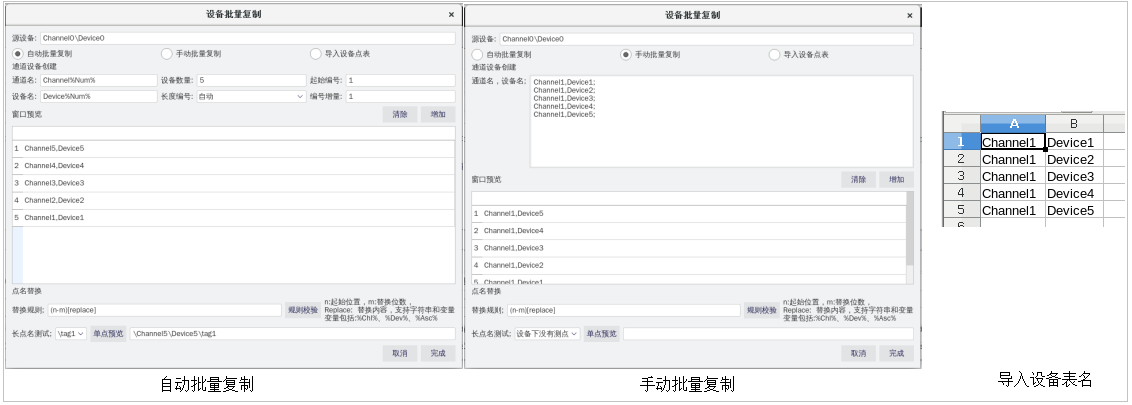 手動(dòng)復(fù)制準(zhǔn)確全面:用戶可根據(jù)特殊場景的實(shí)際需求,手動(dòng)輸入通道和設(shè)備名稱,逗號分隔,不同設(shè)備使用分號分隔。因此用戶能夠靈活全面的掌握復(fù)制的內(nèi)容,實(shí)現(xiàn)準(zhǔn)確的批量復(fù)制操作。
