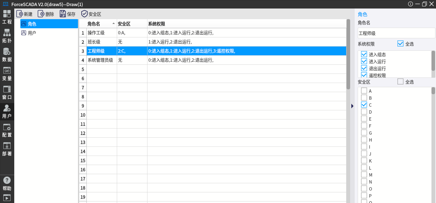角色管理功能為現場提供了更加靈活和高效的權限控制方式。通過定義不同的角色,如操作工、班長、工程師、系統管理員等,為每個角色分配相應的系統權限和安全區,確保每個用戶只能執行其職責范圍內的操作。大大減少了誤操作的可能性,并降低了由于權限不當導致的安全風險。
