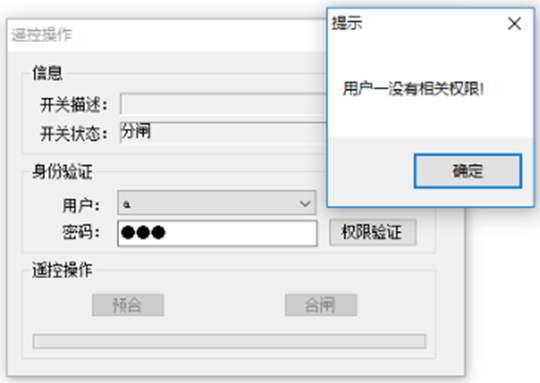 3. 完成遙控組態(tài)進入運行界面,點擊遙控組件,輸入有遙控權(quán)限的用戶名及密碼(若組態(tài)時選擇雙席校驗,則需要輸入兩次),開始遙控,若用戶不具備控制權(quán)限,彈出提示;