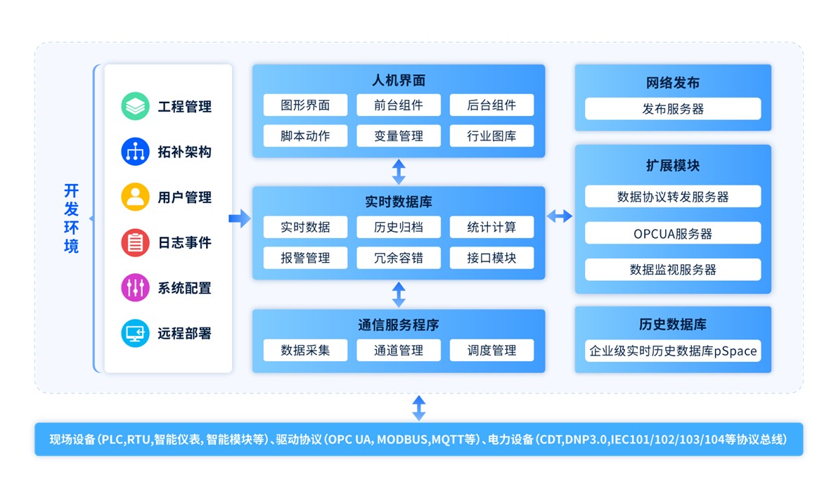 pSpace支持主流國產CPU芯片及Linux操作系統,可與國產PLC 設備、關系數據庫等廠家集成應用。系統內置數千種工業通信協議,輕松集成異構控制系統,助力企業實現生產過程數據的全面采集、高效存儲與智能分析。同時,pSpace支持集團化級聯部署、跨平臺混合部署、溫備/熱備冗余、斷線緩存、歷史回補、遠程運維管理和計算引擎等功能,輕松滿足企業多樣化的需求。