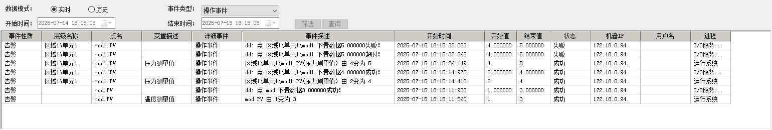 事件服務采用獨立存儲機制,將事件數據獨立管理,與運行日志分離,提升查詢效率。例如,用戶只需在事件界面選擇所需查看的事件類型,或是輸入描述關鍵詞如“泵A故障”,即可快速找到相關記錄。