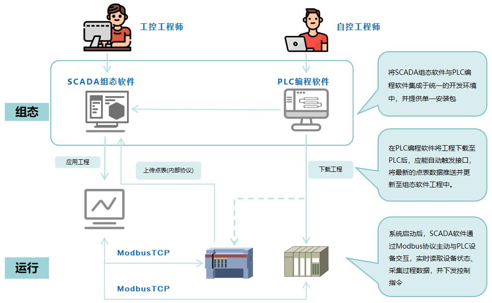 力控 ForceSCADA(信創SCADA)同國內某知名PLC廠商深度合作,通過抽象公共代碼+配置文件方式,快速實現測點組態和數據采集。在此基礎上進一步把組態軟件和PLC編程軟件深度集成,實現SCADA對PLC點表的在線訪問。