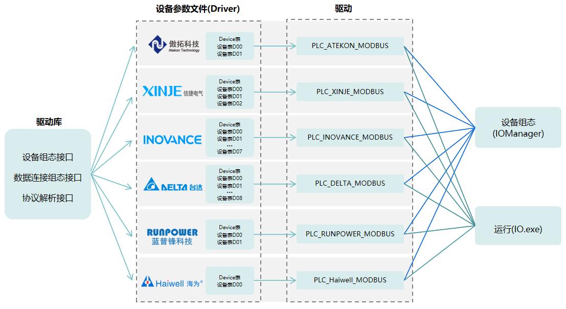 力控科技采用“公共代碼 + 配置文件”的抽象產品開發模式,將不同廠商PLC的通信差異通過配置文件進行定義,代碼層則通過解析配置文件的內容實現差異化處理。該模式把Modbus通信復雜的功能都封裝在代碼內部,既節省了開發成本,又降低了工程師的使用門檻,并且實現國產PLC基于Modbus協議通信的“三快”目標:開發適配快、使用上手快、組態建點快。