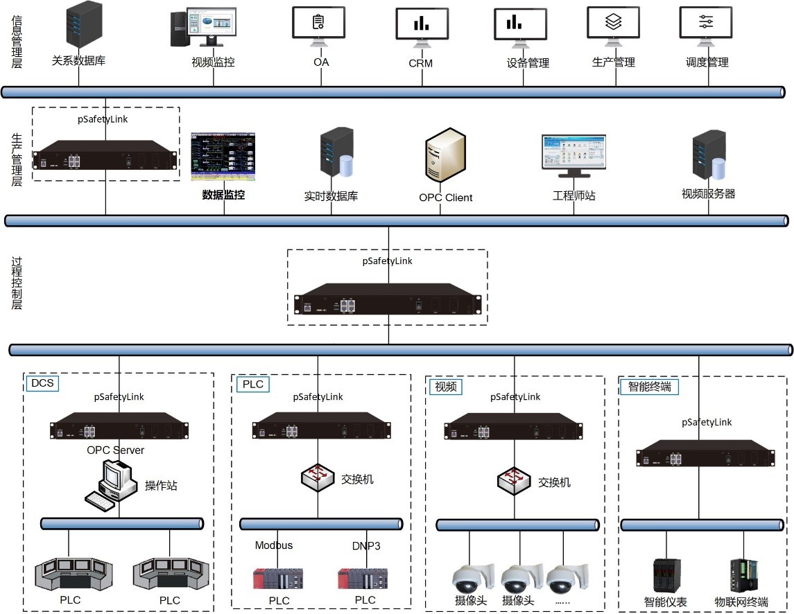 pSafetyLink部署在信息管理層與生產管理層之間,用來阻止來自信息網的DOS/DDOS攻擊、惡意掃描、異常數據包等安全威脅;可對通用網絡協議進行訪問控制和安全過濾,并且支持對工控主流協議進行訪問控制及深度解析,可以限制只有可信任的數據能夠在工控網絡中傳輸,有效保護了工控網絡的安全。