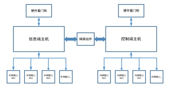 由兩個獨立主機系統組成,一端的主機系統為控制端,用于連接控制網絡。另一端的主機系統為信息端,用于連接信息網絡。兩端主機均采用高性能嵌入式硬件,主板上各有多個以太網接口用來連接要隔離的兩個網絡,兩端主機通過隔離裝置進行連接,保證數據交互的安全性。
