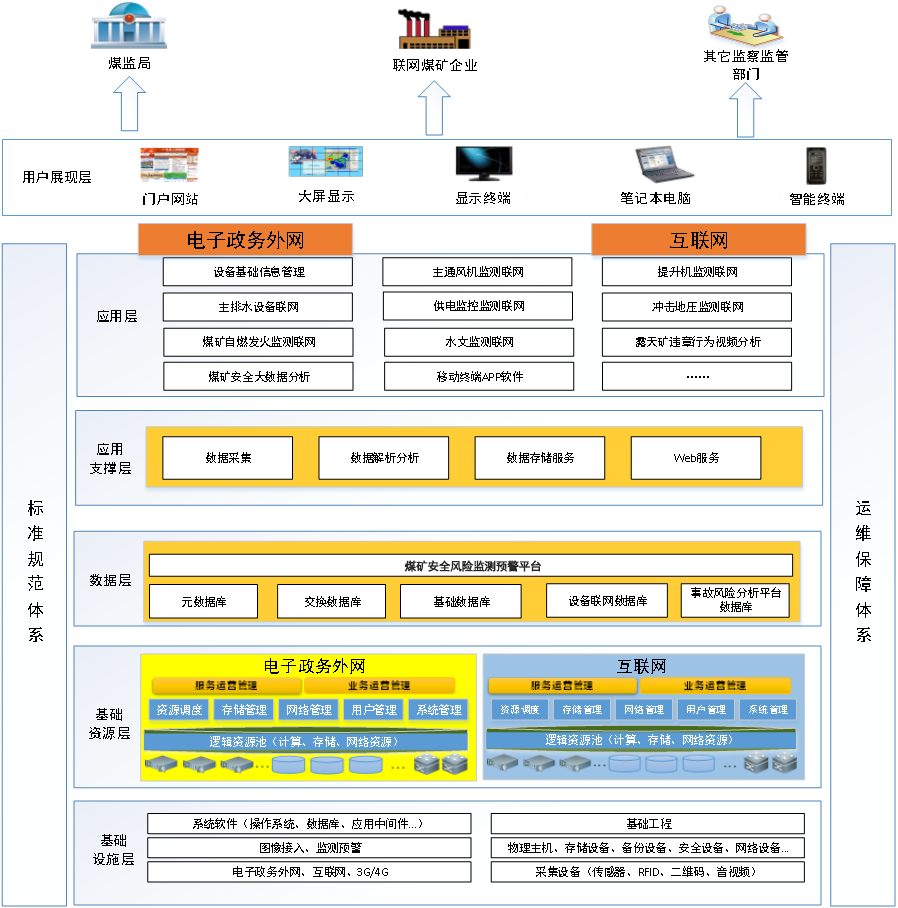煤礦安全風險監測預警系統解決方案依據國家煤礦安監局關于加快推進煤礦安全風險監測預警系統建設的指導意見,綜合利用物聯網、大數據、云計算與移動互聯等相關技術,接入具備條件礦井的重大設備與監測監控系統數據,實現煤礦設備基礎信息管理、重大設備與監測監控系統聯網、露天礦違章行為視頻識別、煤礦安全大數據分析等功能為一體的安全風險監測預警系統,為政府監管監察、煤炭企業服務,督促企業落實安全風險防控主體責任,為循數管控、分級監管、精準執法提供信息化支撐保障。