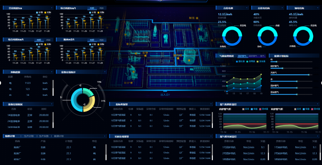 實現整個能源生產、輸送、使用全過程中工藝參數、質量數據、能耗值、環保數據、設備狀態等數據的實時、自動采集,對整個生產過程進行實時監控及智能報警,對動力系統的異常和故障借助于綜合監控系統的信息進行快速判斷和處置。