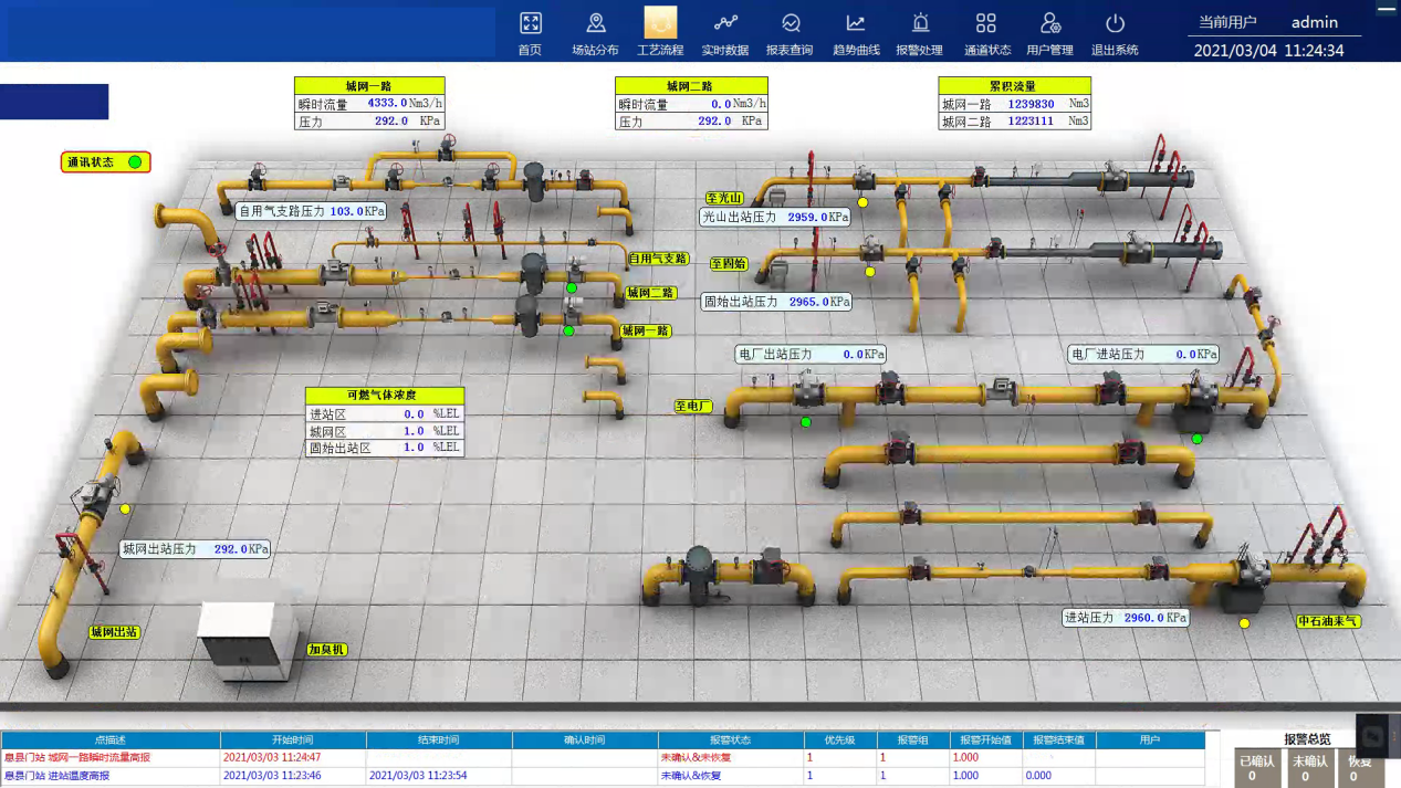 生產(chǎn)運(yùn)行監(jiān)控主要借助SCADA系統(tǒng)將分布在管轄區(qū)域內(nèi)場(chǎng)站、閥室、調(diào)壓站、用戶、加氣站所采集的管網(wǎng)設(shè)備的運(yùn)行參數(shù)匯集上來(lái),從而掌握整個(gè)管網(wǎng)的運(yùn)行情況,并對(duì)運(yùn)行設(shè)備進(jìn)行實(shí)時(shí)監(jiān)控。系統(tǒng)出入口采用GIS地圖和場(chǎng)站檢索組合方式,可通過(guò)地圖查看也可通過(guò)搜索進(jìn)入該場(chǎng)站。