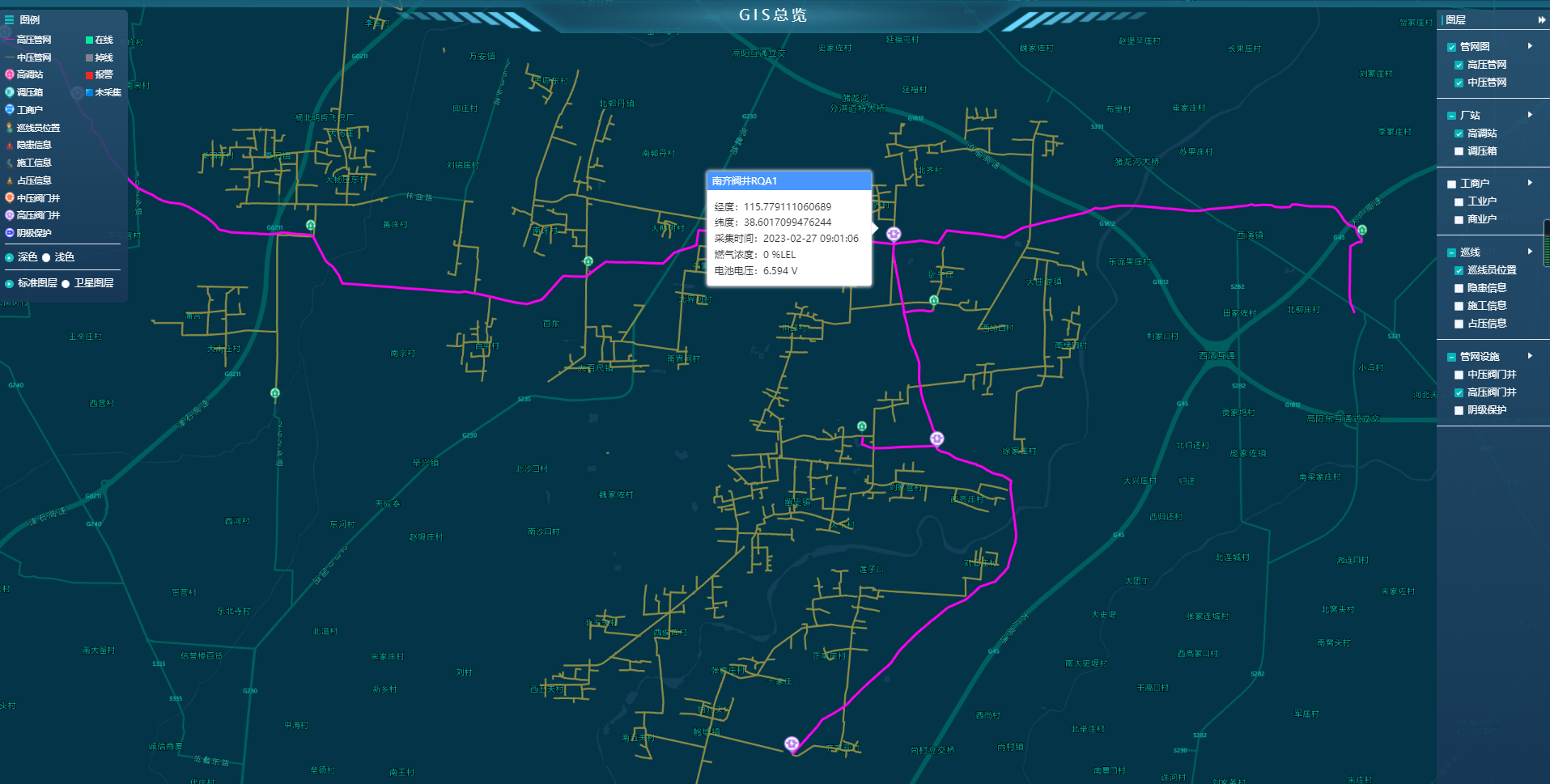 通過(guò)地理圖形實(shí)現(xiàn)對(duì)管網(wǎng)設(shè)備資源的管理和定位,集成SCADA系統(tǒng)數(shù)據(jù)和遠(yuǎn)程視頻監(jiān)控圖像實(shí)現(xiàn)對(duì)管網(wǎng)資源的實(shí)時(shí)監(jiān)控,實(shí)現(xiàn)對(duì)管網(wǎng)區(qū)域中危險(xiǎn)源的登記和施工信息的管理,實(shí)現(xiàn)對(duì)人員的跟蹤和對(duì)車輛的實(shí)時(shí)監(jiān)控,為綜合調(diào)度指揮服務(wù)。