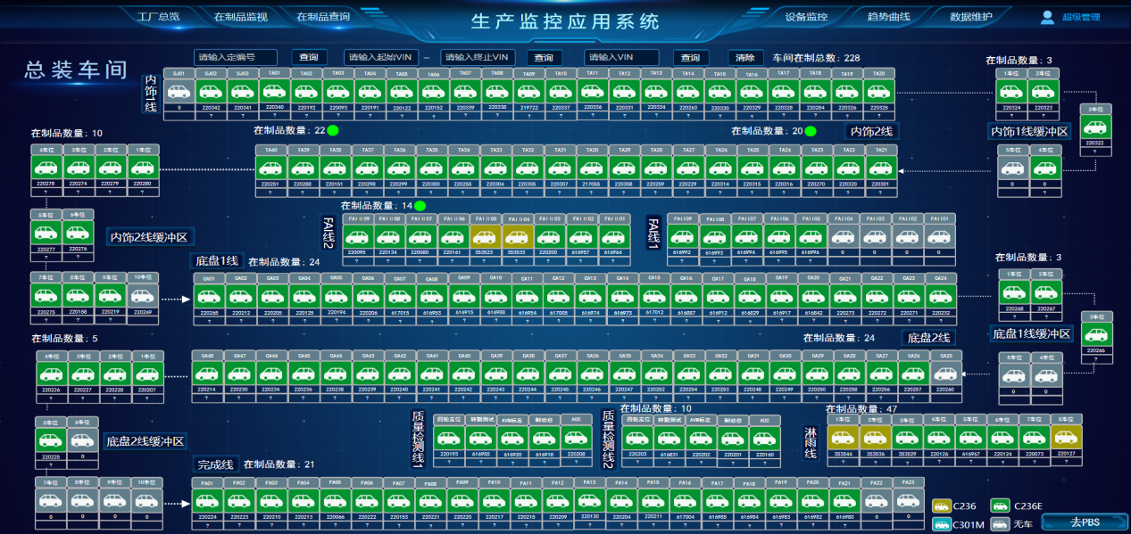 基于GIS位置的一圖可視化追蹤及查詢(xún),可以直觀呈現(xiàn)在制品的當(dāng)前工位、工位狀態(tài)、產(chǎn)品車(chē)型、車(chē)輛VIN、質(zhì)量狀態(tài)等信息,幫助管理者快速了解生產(chǎn)現(xiàn)場(chǎng)情況,并做出相應(yīng)決策,實(shí)現(xiàn)及時(shí)預(yù)警,提高流轉(zhuǎn)效率。