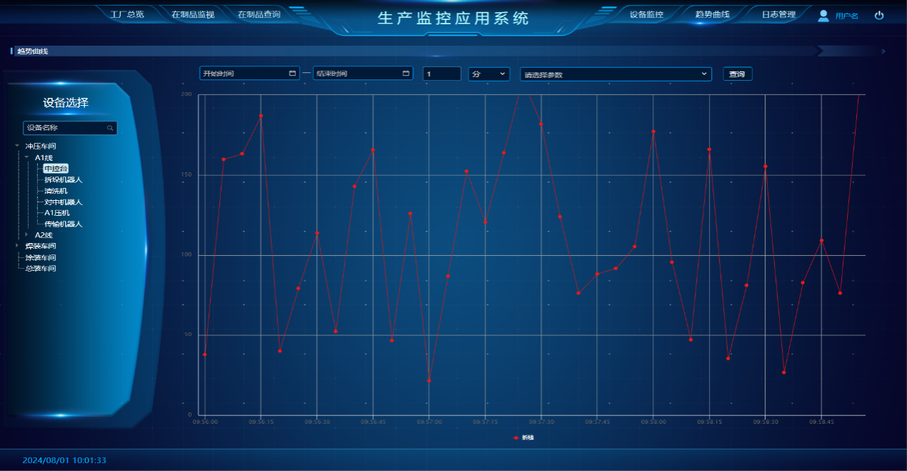 按照車(chē)間、產(chǎn)線、設(shè)備等分類(lèi)形成趨勢(shì)曲線,可查詢(xún)車(chē)間設(shè)備模擬量參數(shù)(如流量、溫度、壓力、液位等)的變化趨勢(shì)。